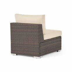 With this Riley Wicker 6 Piece Patio Conversation Set, you’ll have the perfect place to lounge with your family and friends. Made of durable iron and polyurethane wicker, this set includes a table, two armless chairs, a right arm chair, and a left arm chair. Finished in a smooth brown hue, this patio set also features soft off-white cushions for maximum comfort.