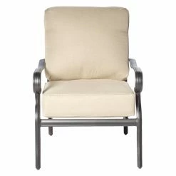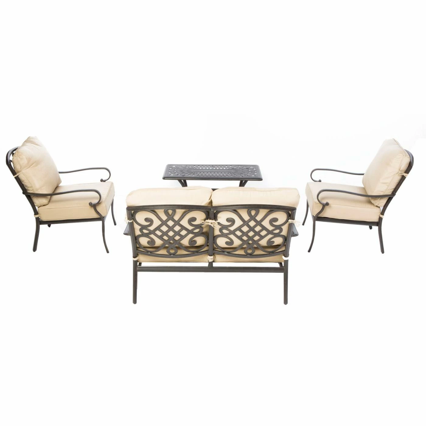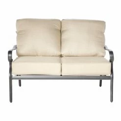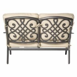 Loving the classics doesn’t mean that you’re married to rusty, outdated wrought iron furniture, especially when you can embrace the past with modern materials that make the Alfresco Home Newbury Cast Aluminum 4 Piece Patio Conversation Set so fetching yet durable. This set is built with frames of cast aluminum that’s covered with a baked-on finish of rust-proof powder-coat. Deep, foam-filled cushions are covered with olefin fabric that’s meant to live a life out in the elements. The removable cushions are covered in a neutral shade of beige that pleasantly complements the dark finish of the chairs, loveseat, and table.