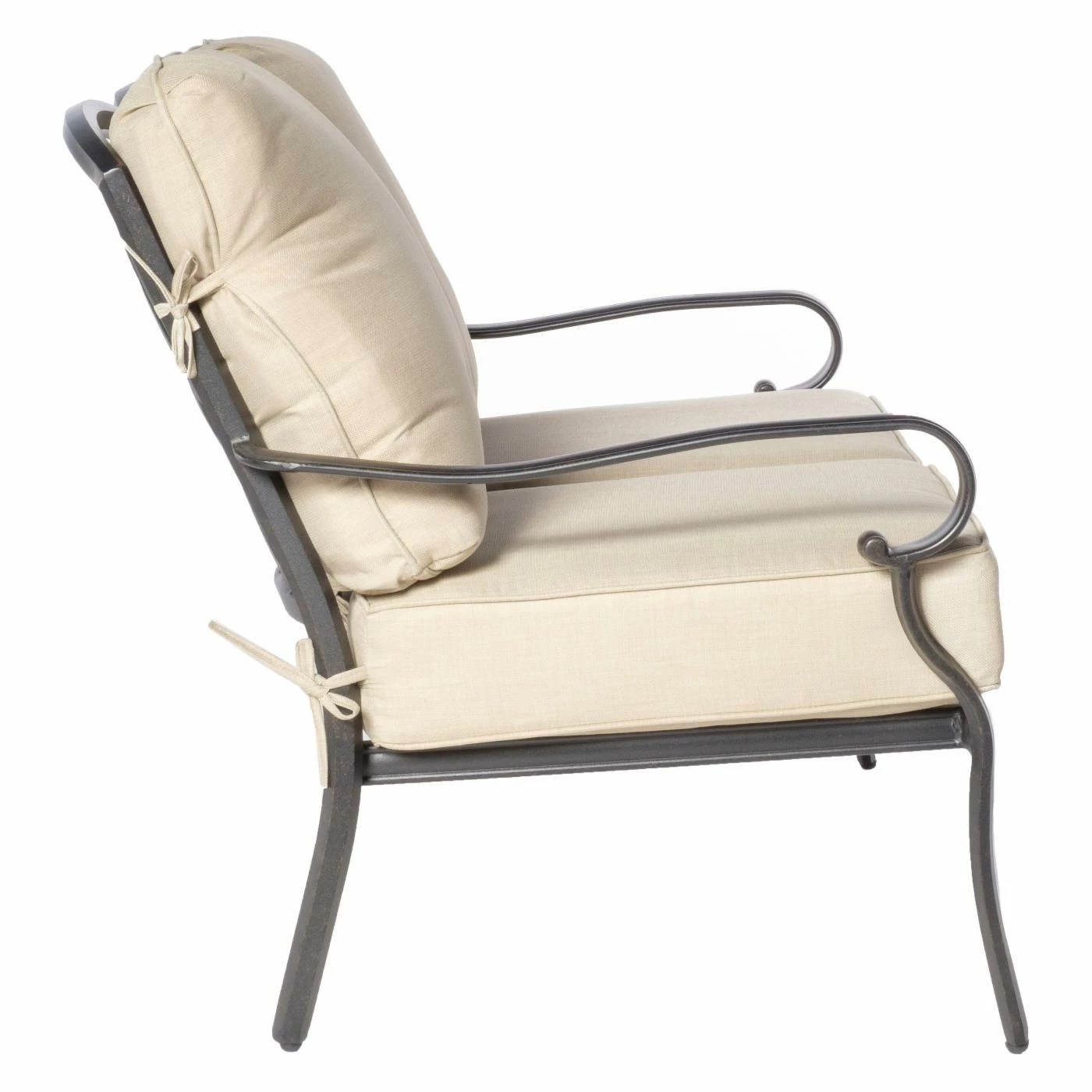 - Cushions attach with ties and Velcro tabs
