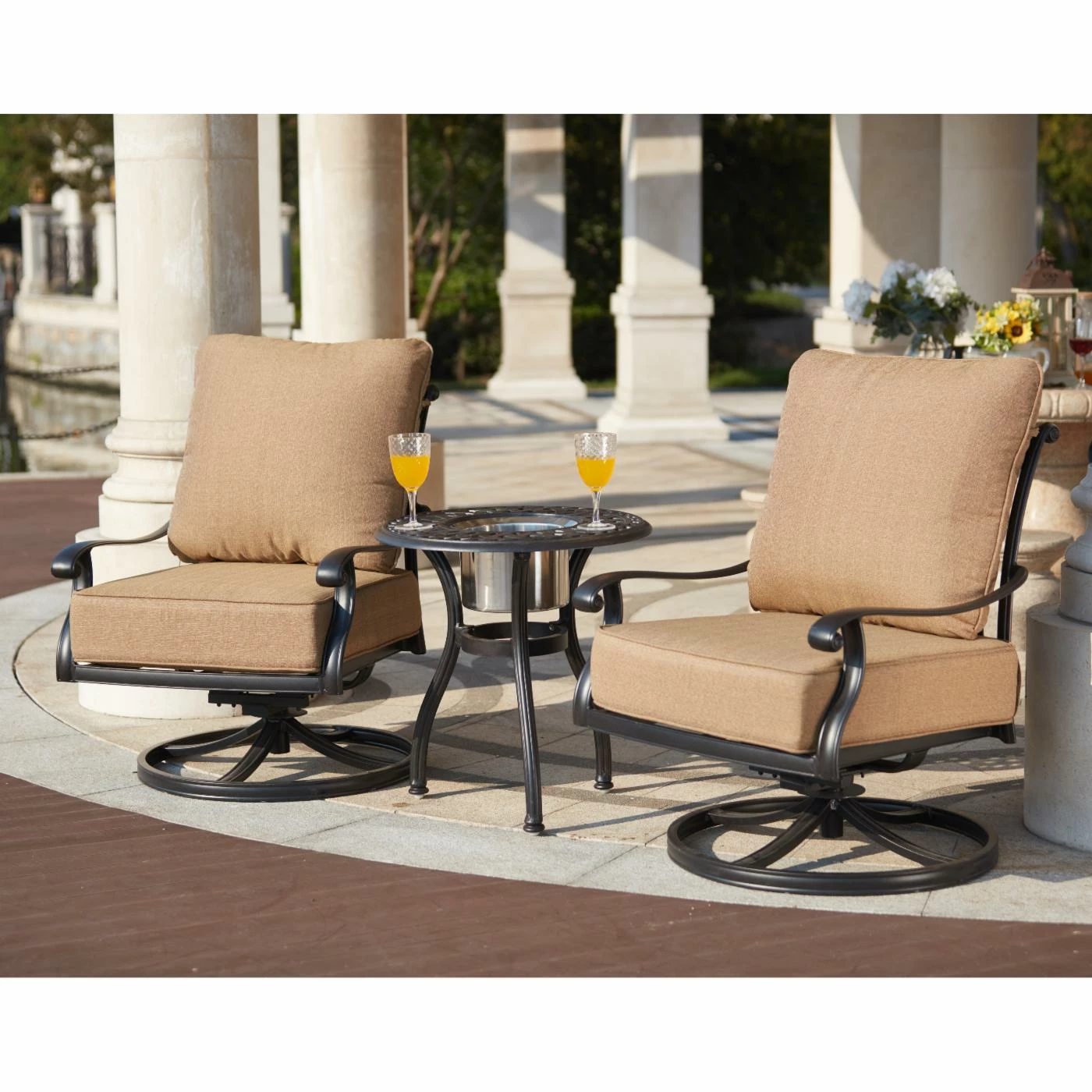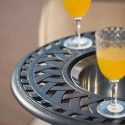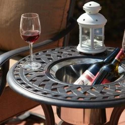 Enjoy drinks on the patio with the antique bronze Darlee Capri 3 Piece Aluminum Round Patio Bistro Set with Ice Table thanks to its ice bucket insert. Pop open the table’s center to gain access to the ice bucket or leave it closed for more table space. Made with cast aluminum, this chat set offers durability and a light weight. Each piece also features traditional lattice cutouts that promote fast drying. Covered in plump polyester cushions, the Darlee Capri bistro set offers optimal comfort while remaining water-resistant and durable. Its nylon glides help protect your floors.