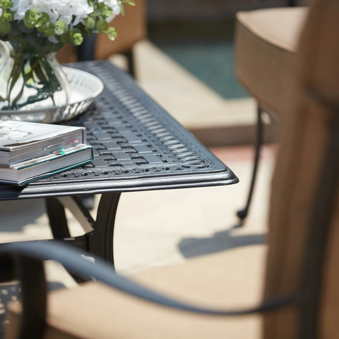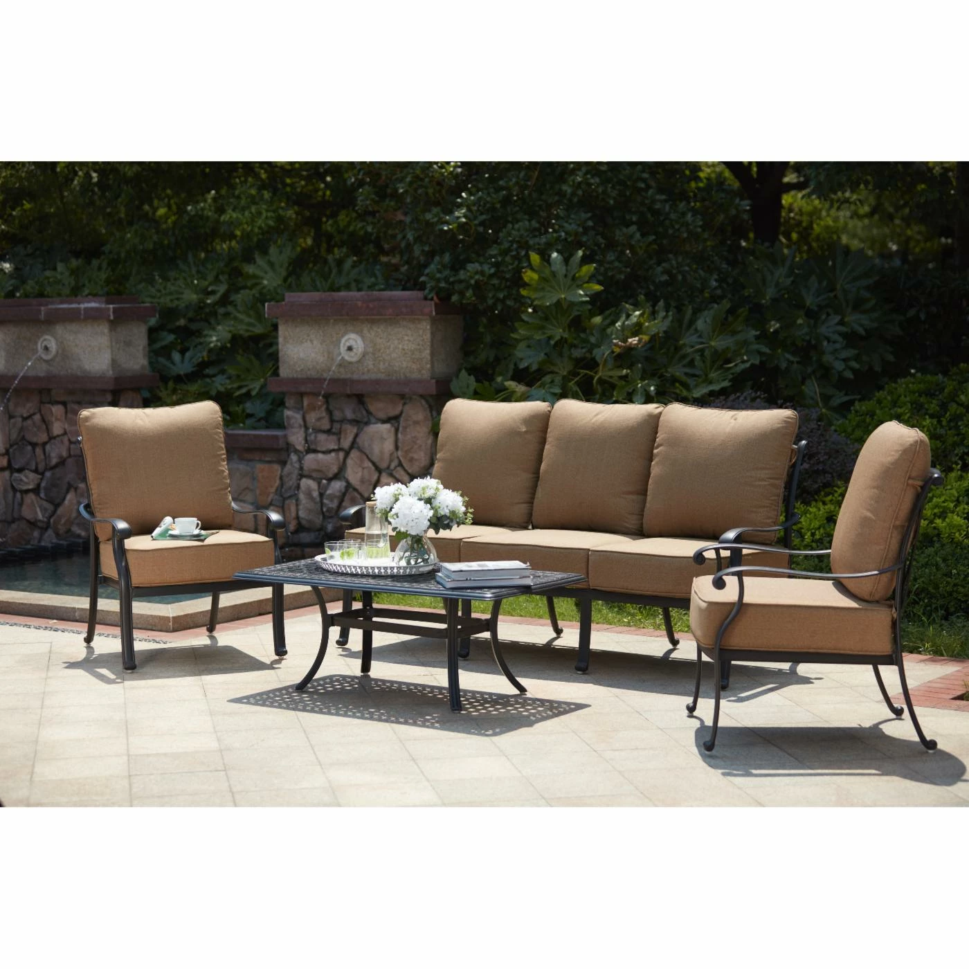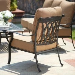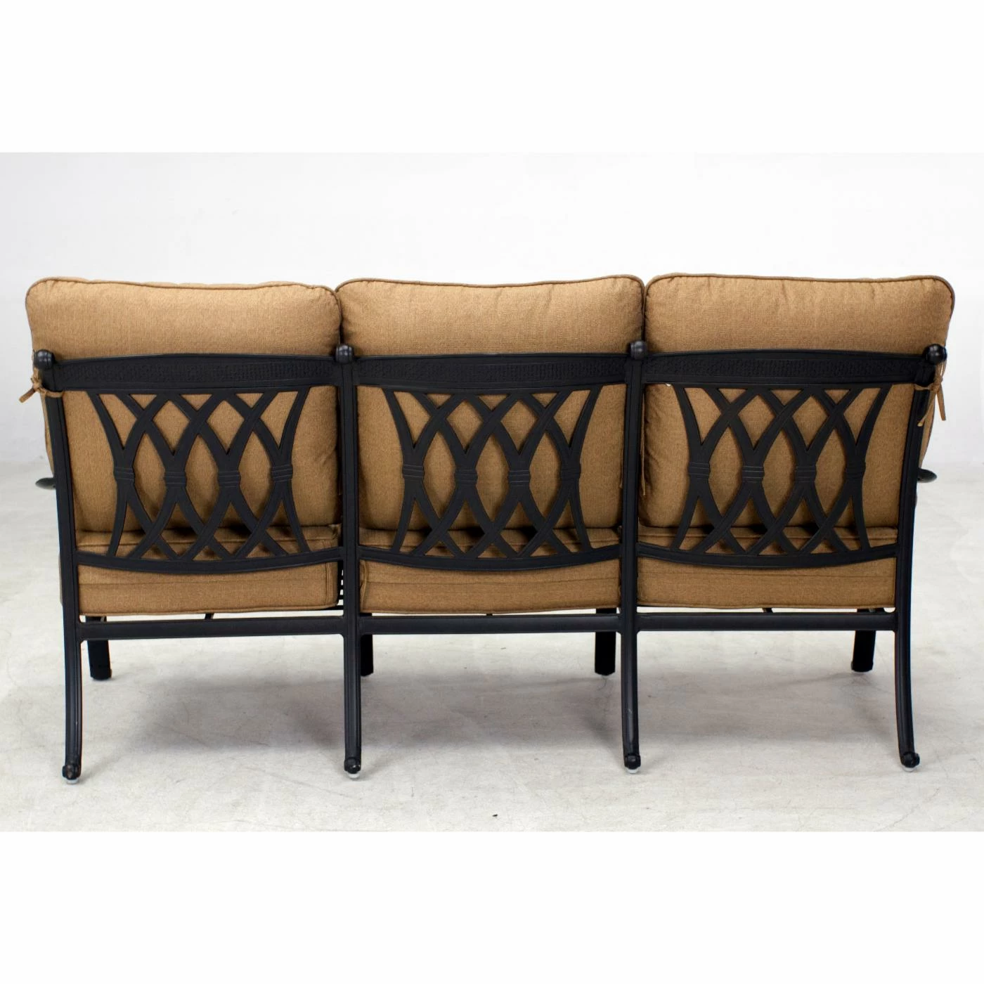 - Beige cushions on an antique bronze finish
