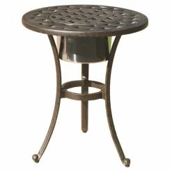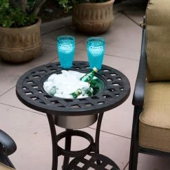 Once you have the Darlee Nassau 3 Piece Aluminum Club Patio Bistro Set, you’re just a phone call away from inviting someone over and having a new best friend for life. Who wouldn’t mind spending an afternoon sinking into the deep cushions of this high-end set, while you sip a drink you’ve just pulled from the matching ice bucket? This set is hand-crafted using cast aluminum that’s been finished with a powder-coat of antique bronze. Thick seat and back cushions are covered with all-weather fabric that’s easily removable for washing. The matching table includes a removable lid that reveals a stainless steel ice bucket.