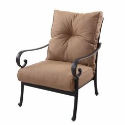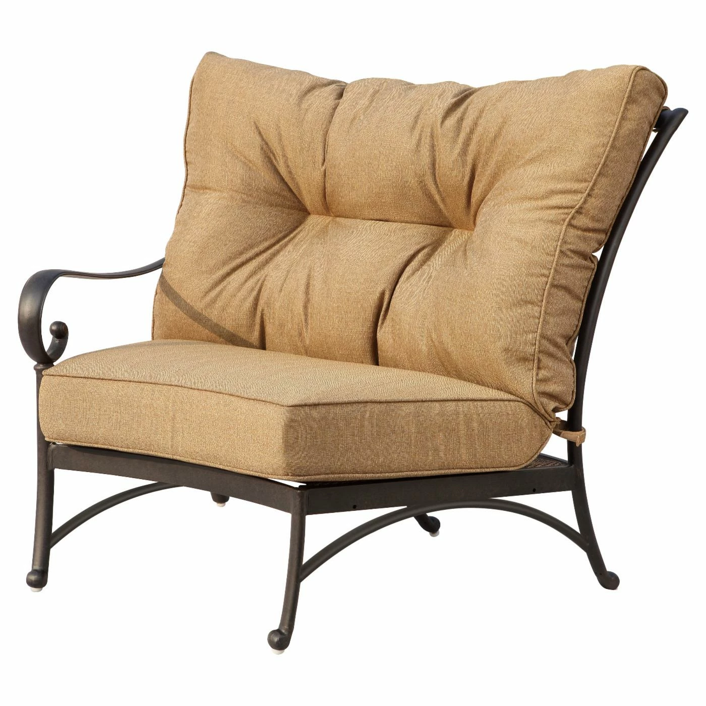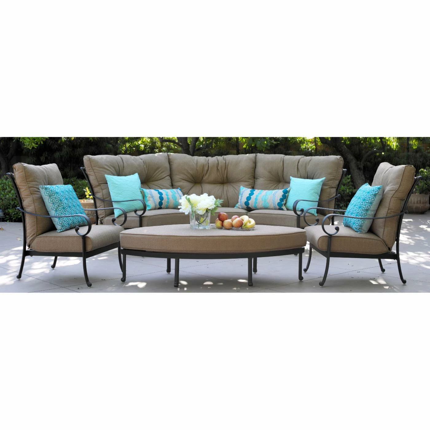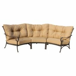 Comfy is as comfy does, and the Darlee Santa Anita Cast Aluminum 6 Piece Patio Conversation Set does comfy really well. This all-weather set is made from cast aluminum frames that show off a slender form with subtle curves and classic touches. The overstuffed cushions are filled with dense foam and covered in 100 percent polyester fabric designed for outdoor use. The semi-circular sofa can be configured all together, or it can be spread out to increase the number of seats. If you keep it together, you can also push in the pointed-oval ottoman to create a wide, comfy space perfect for lounging. Any other time, this ottoman is also able to do double duty as a coffee table.
