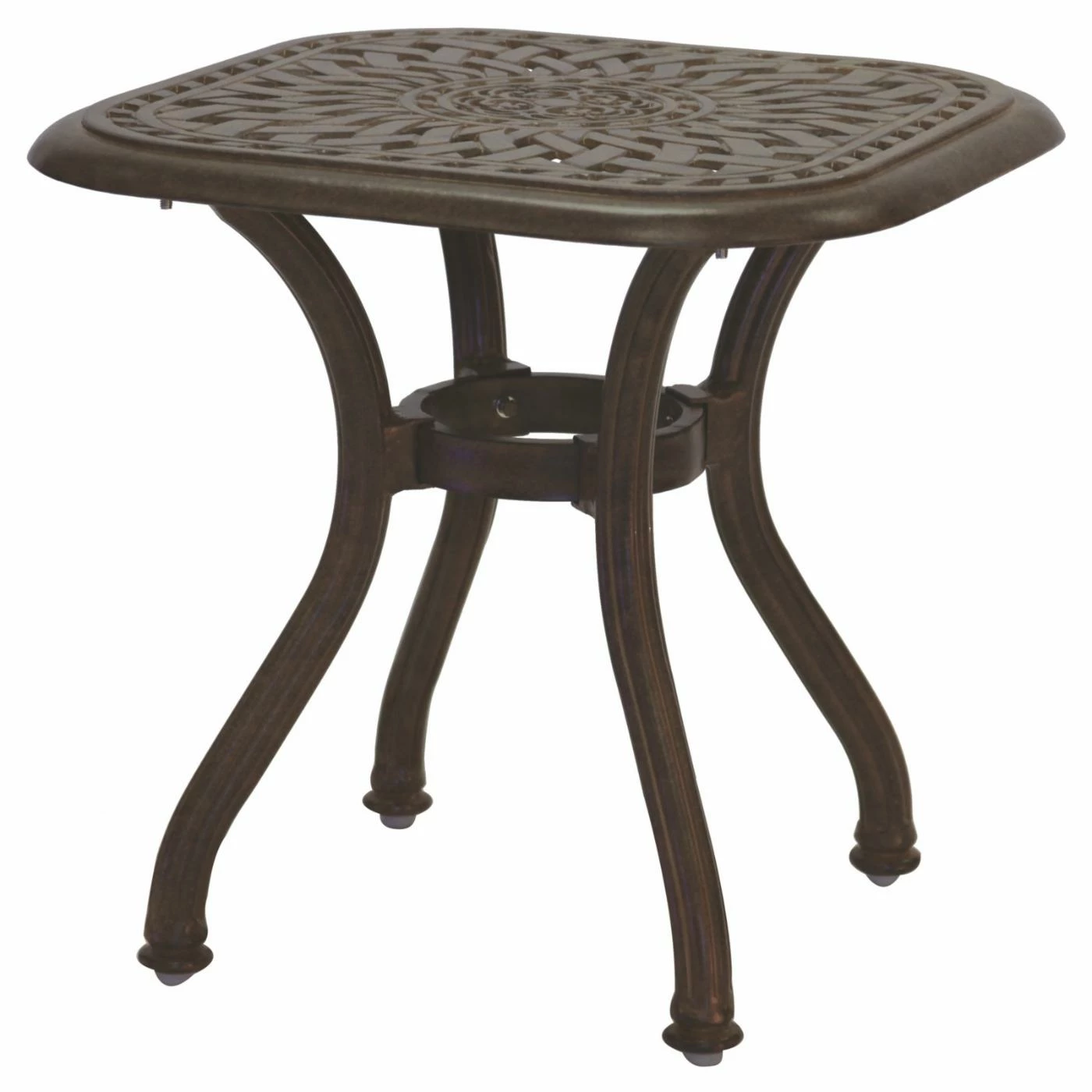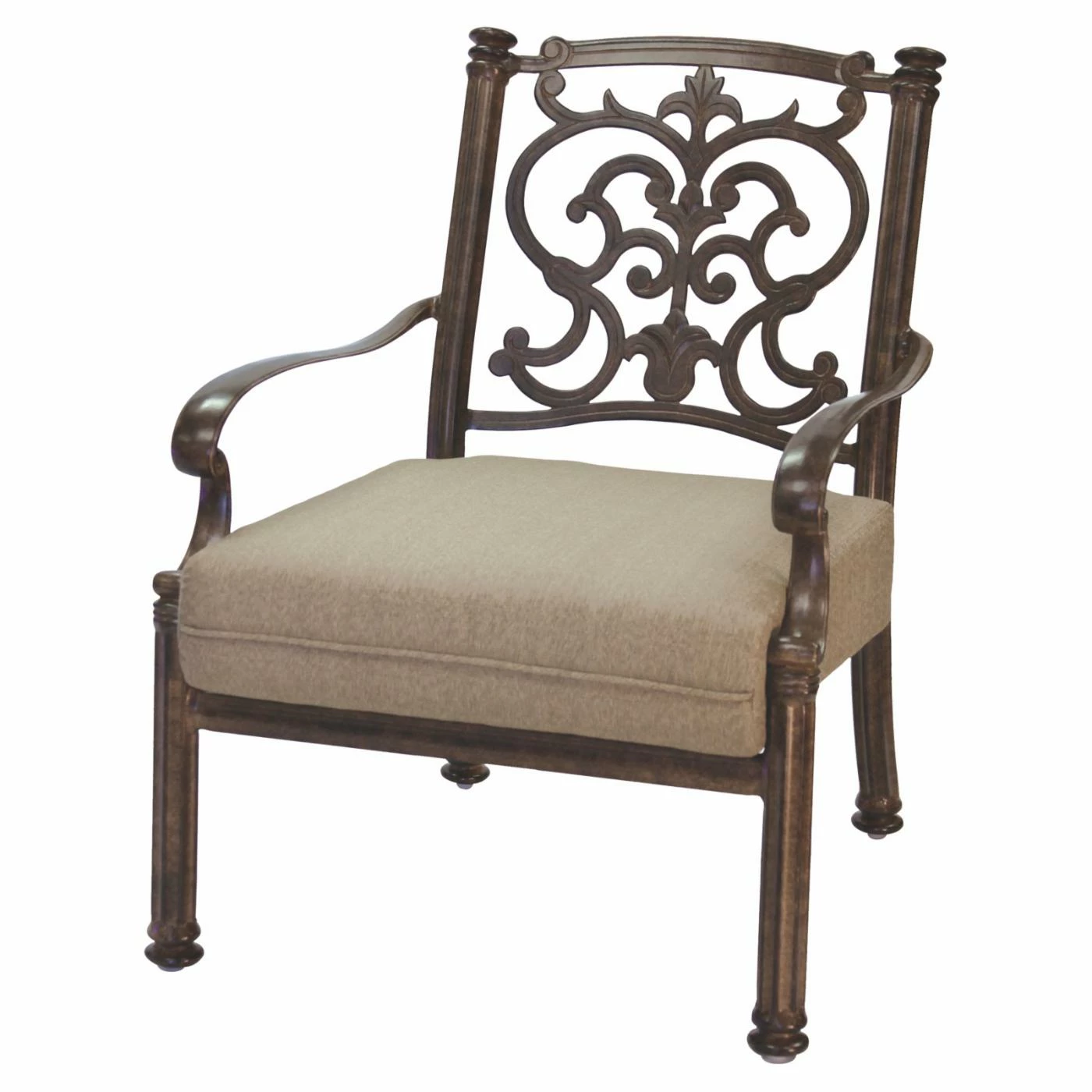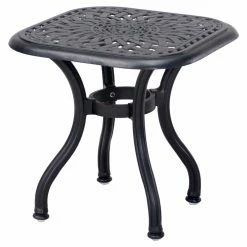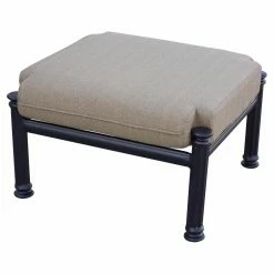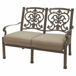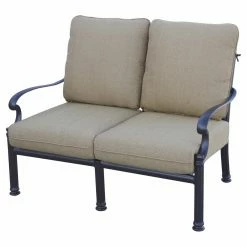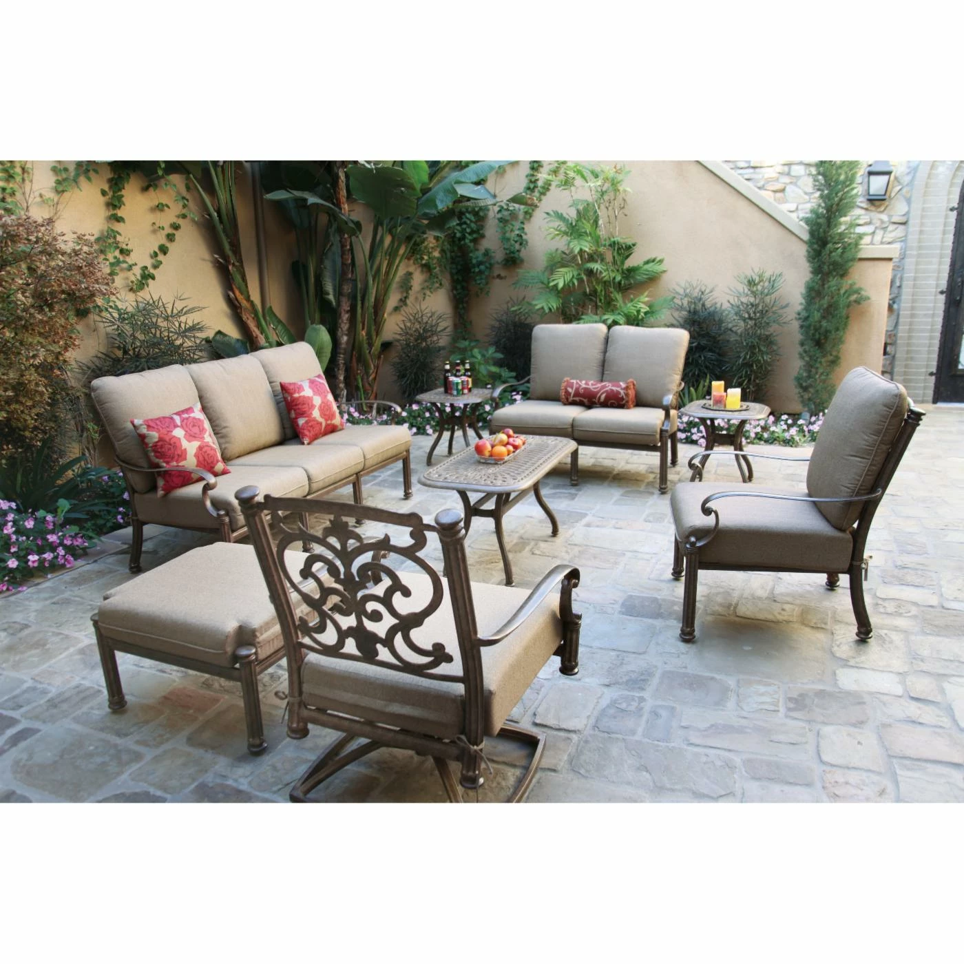 Arrange the Darlee Santa Barbara 8 Piece Aluminum Patio Conversation Set together or situate the pieces in separate groups across your patio – either way, the set creates a sumptuous, stunning atmosphere for conversation and relaxation. Each piece in this generously appointed set – including a loveseat, sofa, club chair, swivel rocker, ottoman, coffee table, and two end tables – is hand-crafted with durable, weather-resistant cast aluminum powder-coated with a multi-step finish; choose from the available color options. The seating elements come with polyester fabric cushions in a soft sesame hue, plus intricately scrolled backs that echo the curled arm rests. The square end tables and coffee table have textural, woven-pattern tops crowning gracefully curved legs. And the low ottoman can serve traditionally as a foot rest or unexpectedly as another table (top with a tray) or spare seat. Manufacturer’s warranties include: one year for the cushions and five years for the frames. Assembly is required.