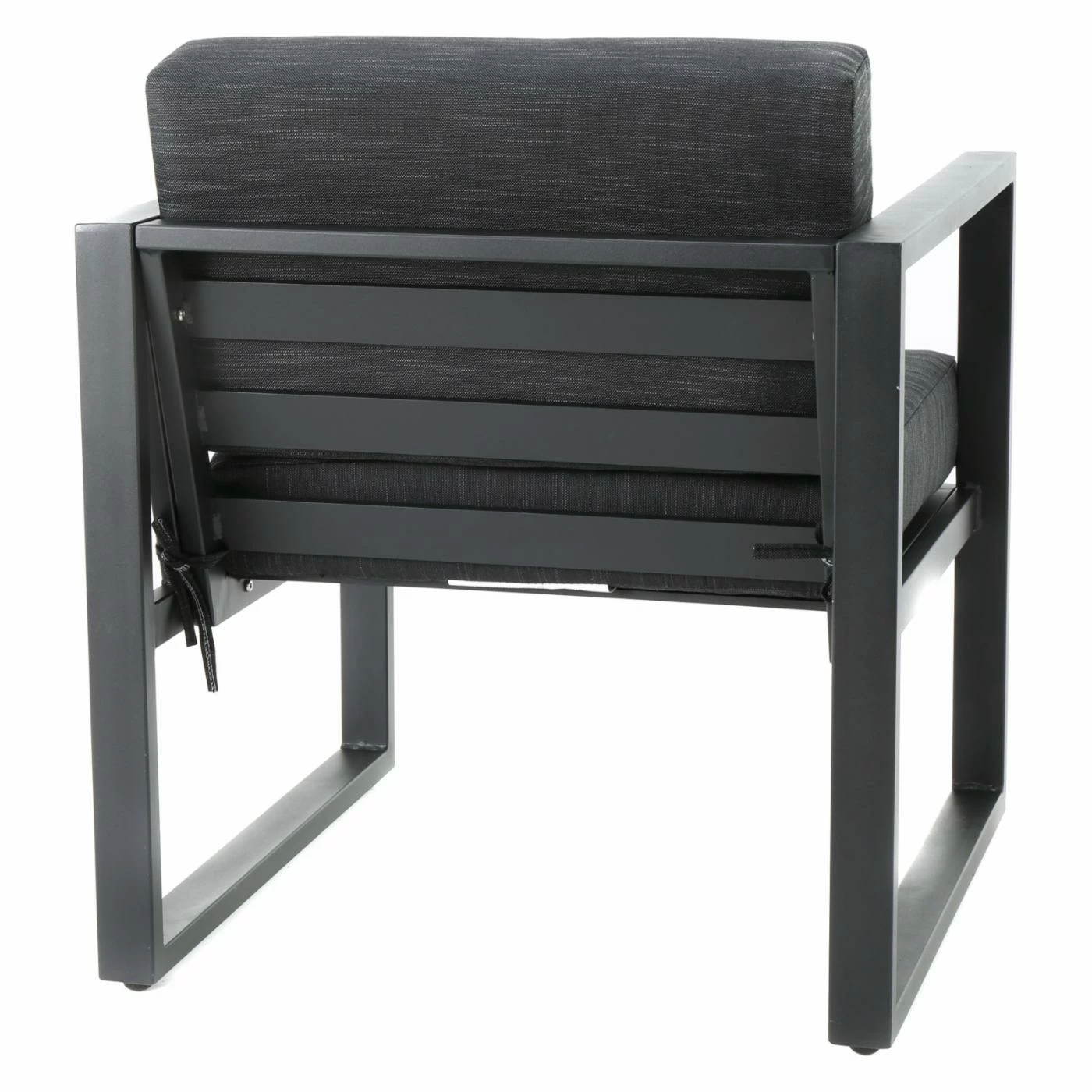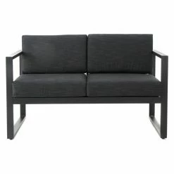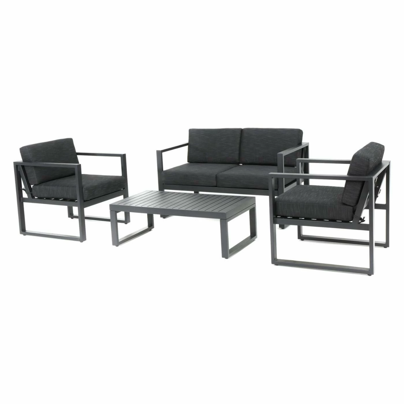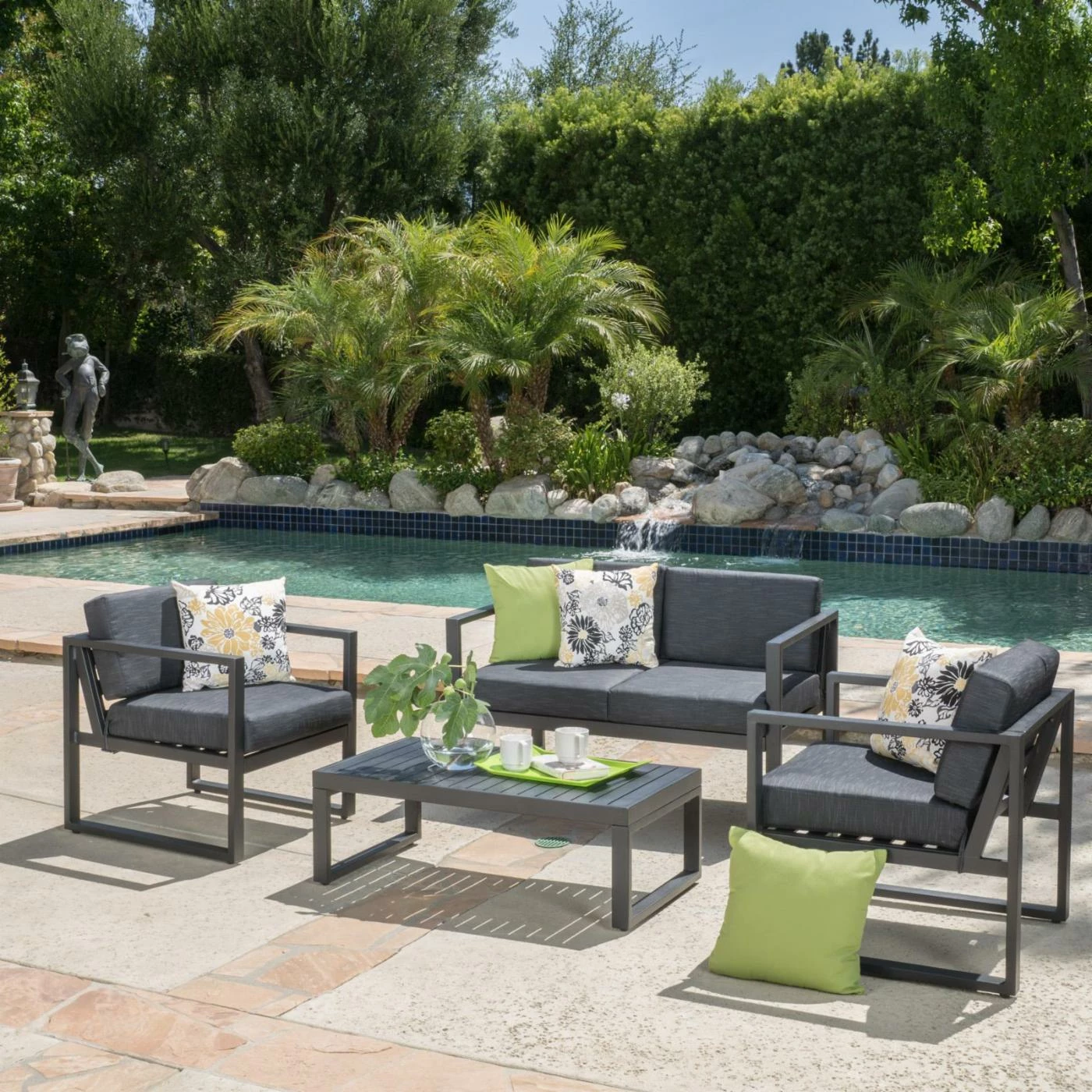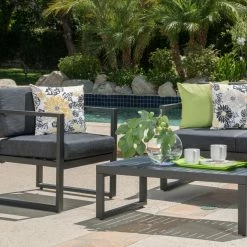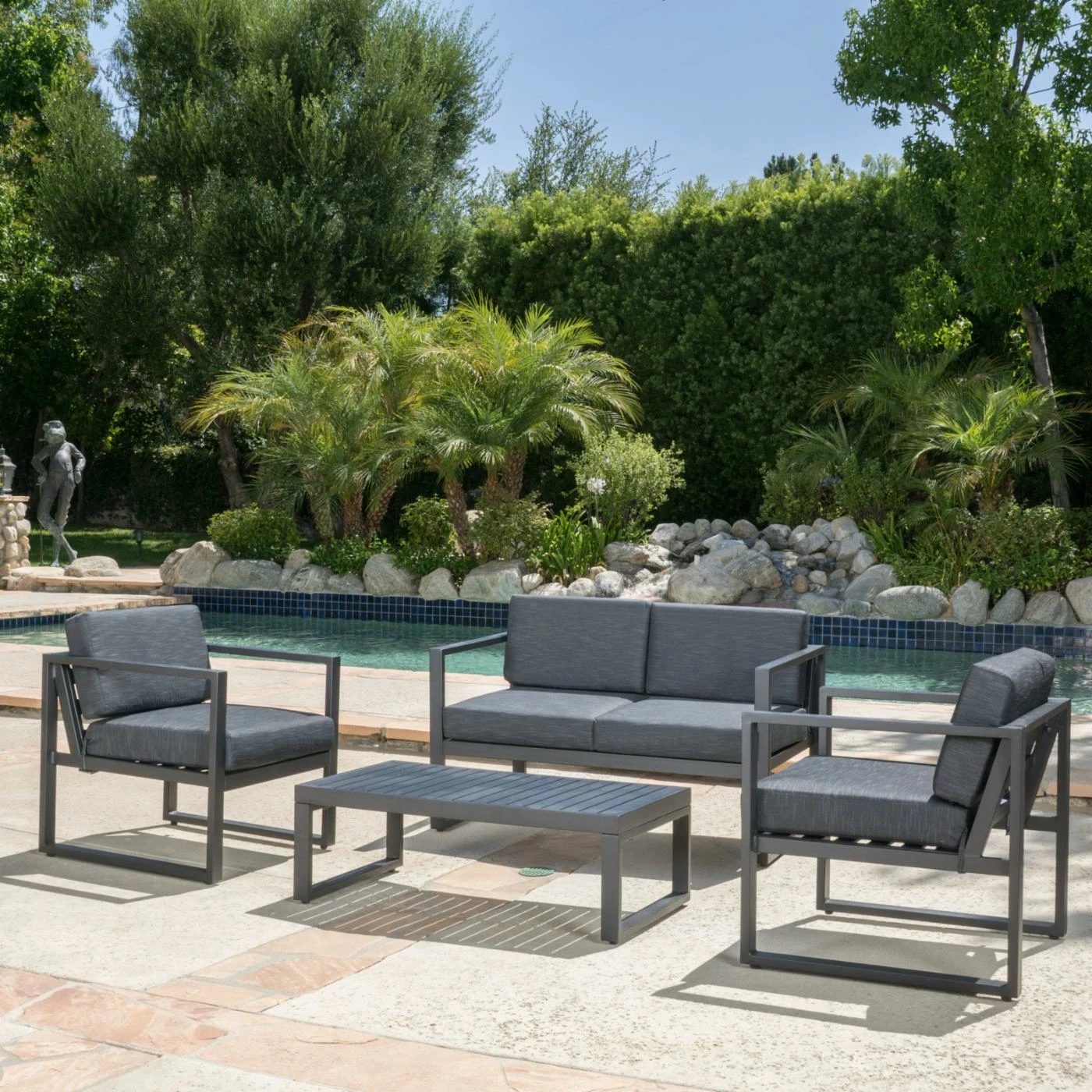 The modern cubed look of this HN Outdoor Maricopa 4 Piece Patio Chat Set adds chic appeal to your outdoor space. This patio chat set includes two cushioned chairs, a cushioned loveseat, and a coffee table. All are made of weather-resistant aluminum in a dark gray finish. Thick, dark gray cushions are made from waterproof polyester fabric. The coffee table has plenty of space for beverages, plates, and decorative touches.