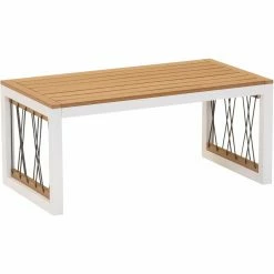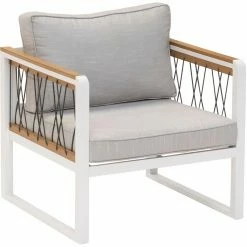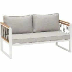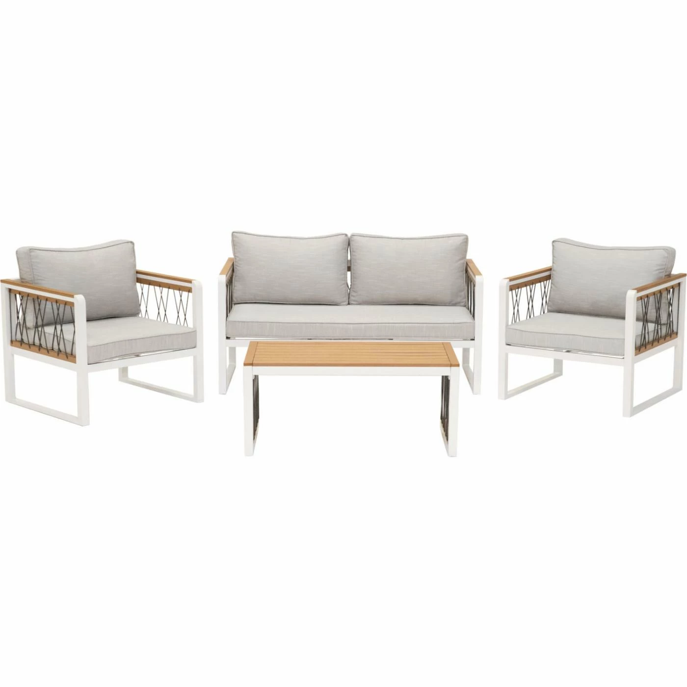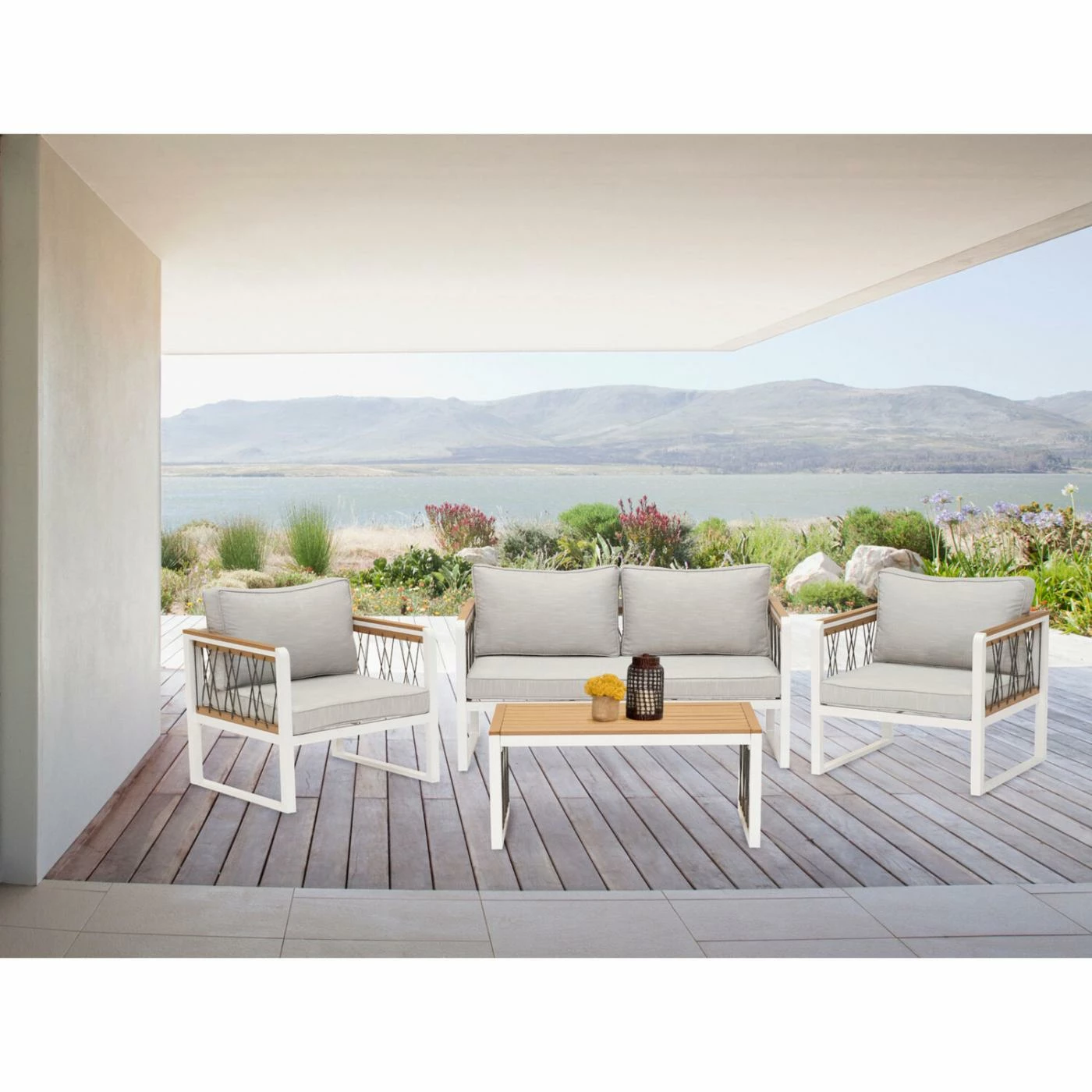 Transform your outdoor space into a luxury retreat with the Mod Furniture Hampton 5 Piece Roped Aluminum Patio Conversation Set. The lounge-worthy collection includes 2 deep seating chairs, loveseat and faux wood top coffee table. Borrowing from Scandinavian design, these stylish pieces possess a bright white and soft gray color scheme, faux wood grain, clean lines and simple accents. The loveseat and deep seating side chairs are crafted from sturdy aluminum frames with a crisp white finish that provides extended protection against rust, scratches, and UV harm. The included plush cushions are comfortable and quick-drying. The faux wood top coffee table also boasts the same durable aluminum frames as the rest of the collection. Tying it all together both literally and figuratively are the decorative rope accents, adding a unique detail to the classic design. Made with weather resistant materials, youβll enjoy the timeless style while having the time of your life for years to come.