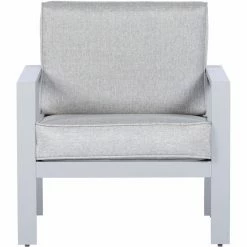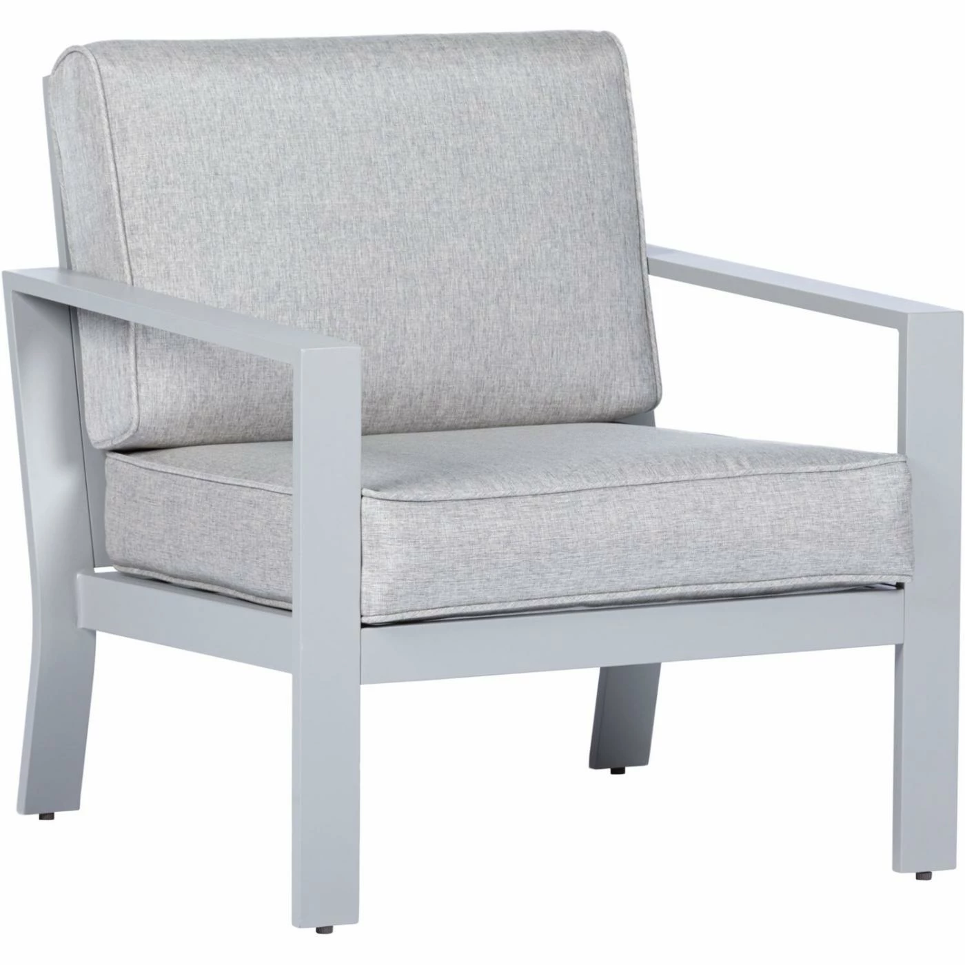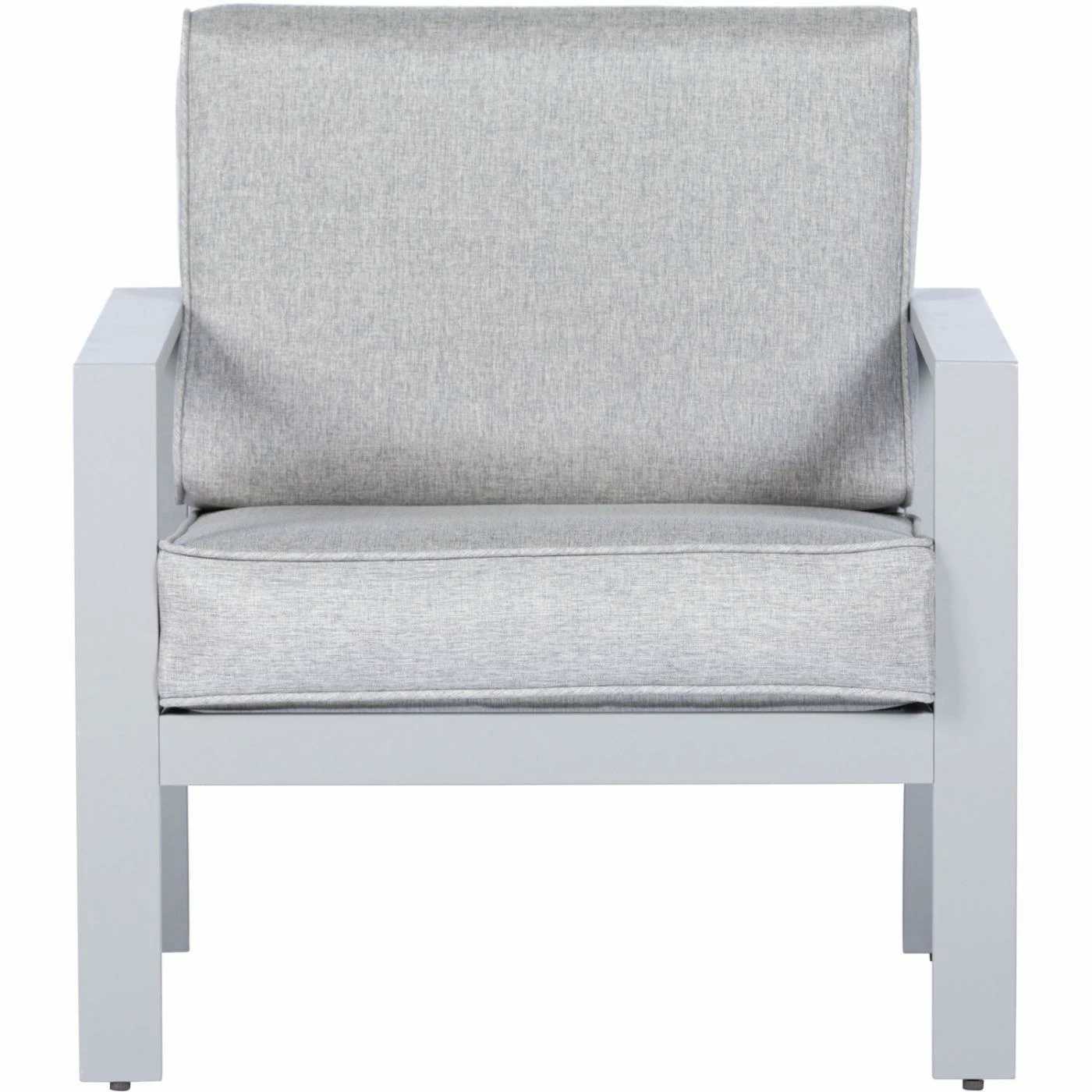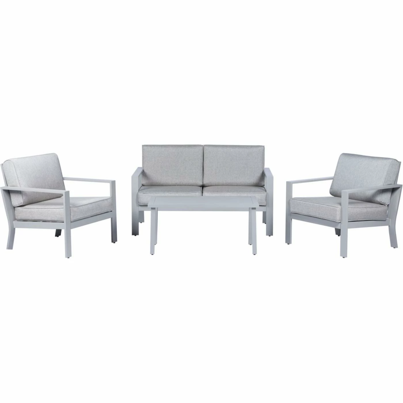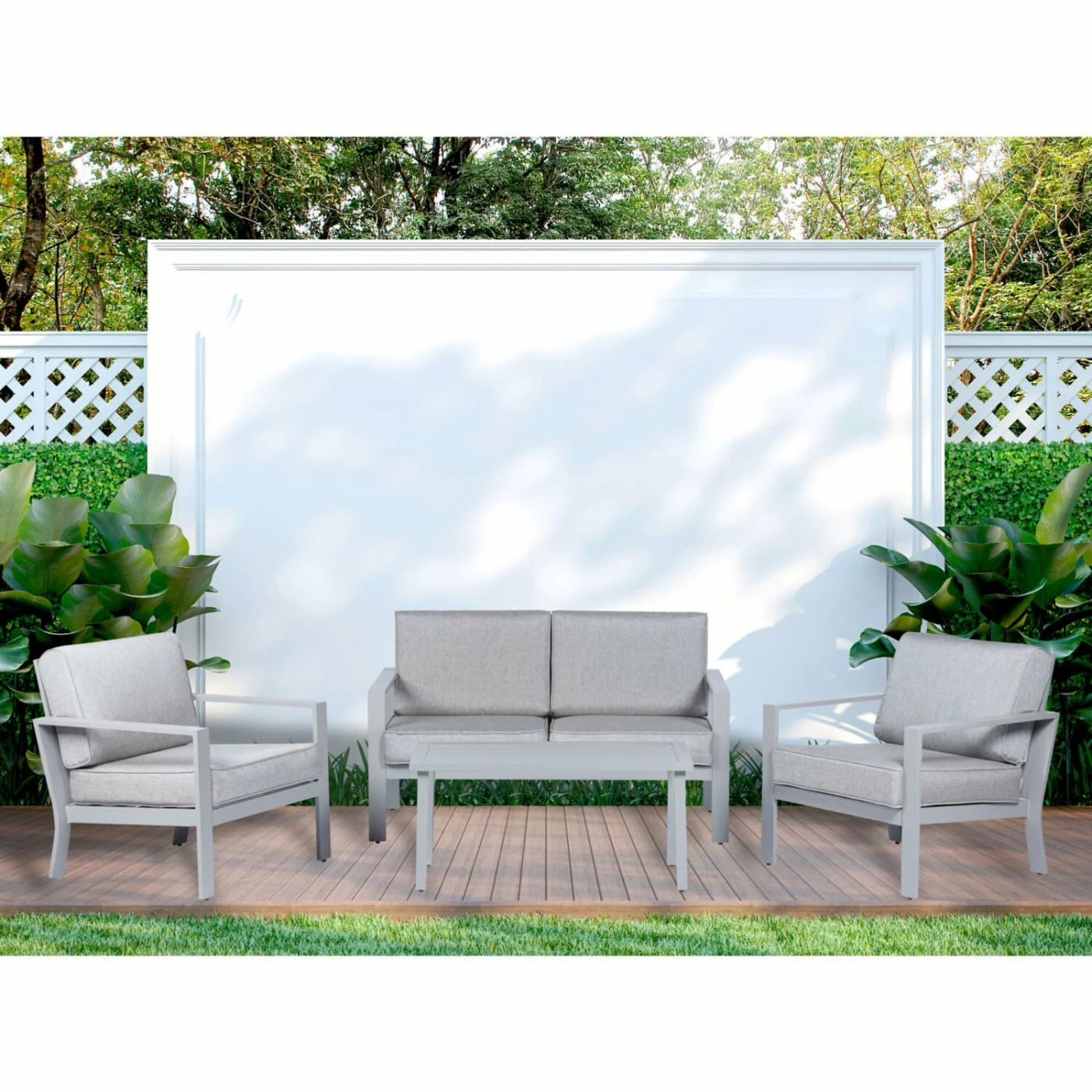 Be ready to conquer summer party season with the Mod Furniture Kinsley 4 Piece Aluminum Patio Conversation Set. Mid-century modern meets contemporary design, itβll bring both style and relaxation to any outdoor space. The collection includes a deep-seating loveseat with two matching deep-seating armchairs and slat top coffee table. The stylish neutral tones mixed with the clean lines of this collection are accented by plush gray cushions covered with weather-resistant outdoor fabric for maximum comfort. Rounding out the set is the slat top coffee table as the perfect landing spot for all your snacks and drinks. Made of weather resistant materials, these pieces allow you to maximize your outdoors, even when you have minimal space.