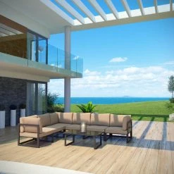 Create the outdoor seating area of your dreams with the Modway Fortuna 7 Piece Aluminum Patio Sectional Sofa Set. Three corner armchairs and three armless chairs are included in this set; gather the pieces together into a sectional or break them apart for individual seats. Tough, powder-coated aluminum forms the furniture frames, which boast a modern, angular design. Each chair comes with a foam-padded cushion that’s upholstered in machine-washable, weather-resistant polyester. Also included is a matching coffee table, complete with a tempered glass top. Choose from the available finish options.