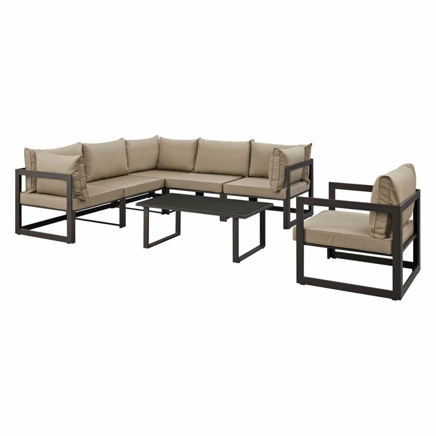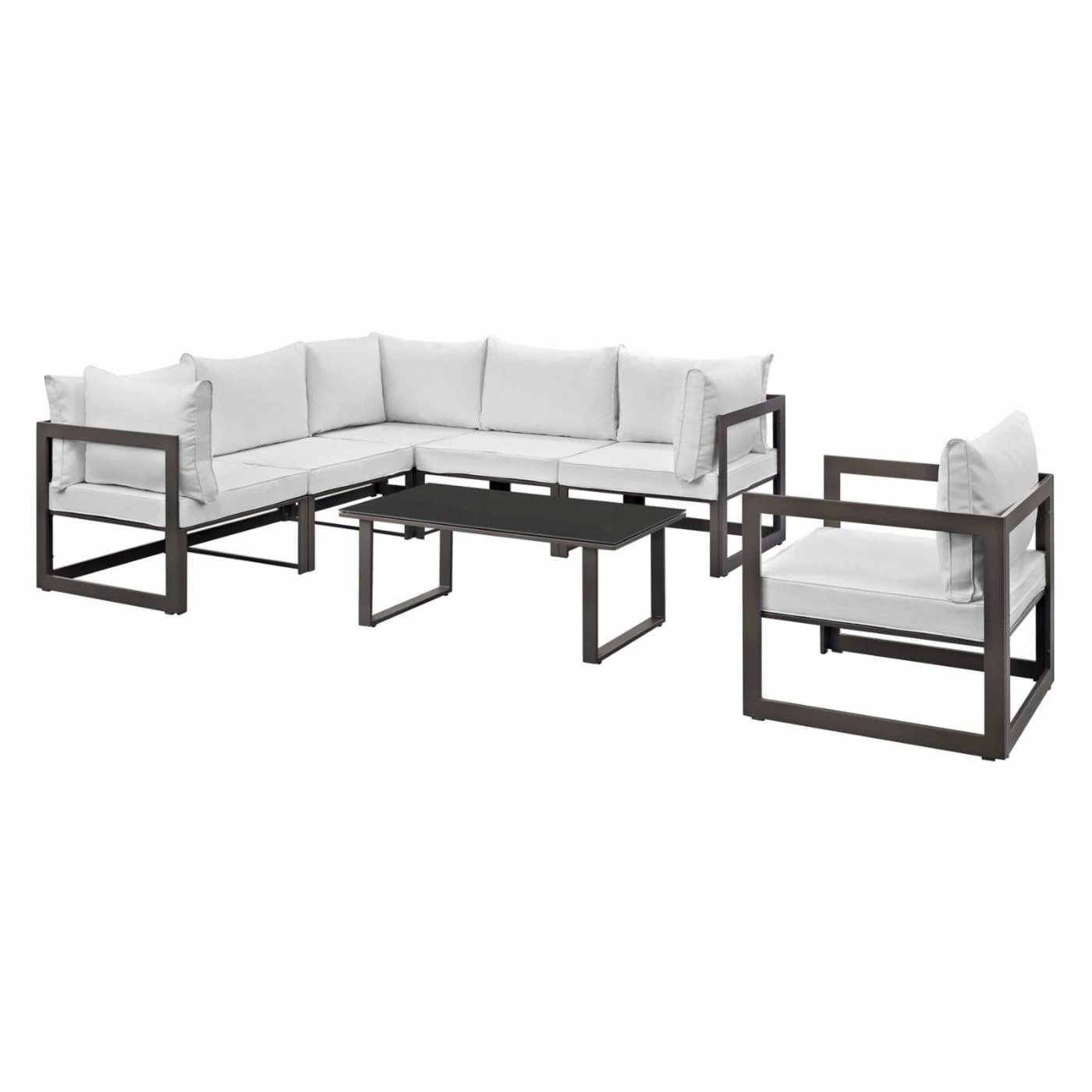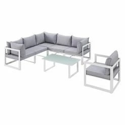 The Modway Fortuna 7 Piece Poolside Patio Sectional Sofa Set provides your patio with a refreshing change from plastic and steel furniture. Each piece in this set boasts a powder-coated aluminum frame that’s as sturdy as it is attractive. The seats feature foam-padded cushions that are just as comfortable as anything in your home but have outdoor-friendly, machine-washable, weather-resistant polyester upholstery. The coffee table surface is a flat piece of tempered glass. Choose from the available finish options.