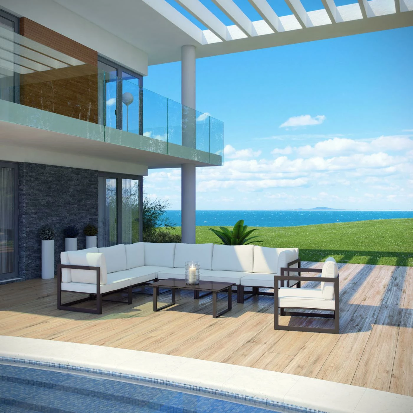 The Modway Fortuna 8 Piece Outdoor Patio Sectional Sofa Set provides your porch, patio, or deck with lots of plush seating options. This set includes three armless chairs, three corner armchairs, and one armchair, each outfitted with thick, foam-padded cushions in machine-washable polyester covers. Accompanying the chairs is a wide, rectangular coffee table with a sleek, modern top made from tempered glass. Every piece in this set is crafted with a powder-coated aluminum frame. Both the frames and the cushions are specifically intended for outdoor exposure. Choose from the available finish options.