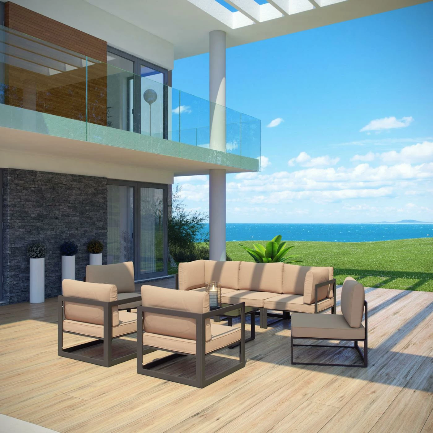 You’ll find yourself using the Modway Fortuna 8 Piece Patio Sectional Sofa Set every time the sky is clear. And don’t worry when storm clouds roll in — each piece in this set is specifically designed for long-term outdoor exposure. Seven chairs are included in this set, capable of being arranged together to create sofas or apart for individual seating. Angular, powder-coated aluminum forms the frames, featuring a tempered glass top for the coffee table. Each chair comes with thick, soft cushions, upholstered in machine-washable polyester. Select from the available finish options.