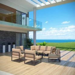 Reinvent your porch or patio with the Modway Fortuna 8 Piece Poolside Patio Sectional Sofa Set. This set includes everything you need for conversations with friends or catching up with the family, featuring seven chairs and a matching coffee table. The chairs (five armless chairs and two corner seats) are all built with thick, powder-coated aluminum frames and topped by soft, dense cushions upholstered with machine-washable, weather-resistant polyester. The coffee table is topped by a rectangular piece of tempered glass. Choose from the available color options.