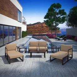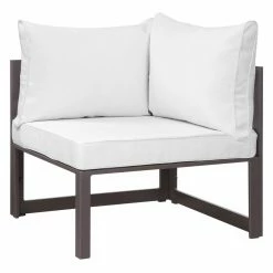 Create a perfect paradise for two — or plenty of pairs — in the comfort of your own backyard with the Modway Fortuna 9 Piece Patio Sectional Sofa Set. This set of patio furniture contains everything you need to kick back after a long week, including two armchairs, two ottomans, two corner armchairs (which can be combined into a loveseat), two side tables, and a coffee table. Every piece in this set is crafted with a powder-coated aluminum frame that withstands the rigors of outdoor exposure. Each seat and the ottomans are topped by thick, foam-padded cushions with machine-washable polyester covers. The tables are each capped by tempered glass tops. Select from the available finish options.