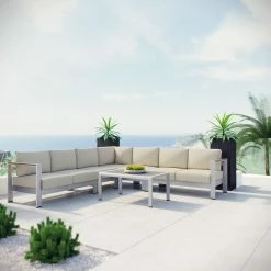 The Modway Shore Aluminum 6 Piece Poolside Patio Sectional Sofa Set gets you out there where the fresh air and vitamin D live. Six modular pieces can combine in various ways to create a landscape for lounging that perfectly suits your outdoor area. Strong anodized aluminum frames won’t rust or corrode, so they’re approved for use near the pool or salty ocean spray. A planked coffee table heightens the sense of casual sophistication; it’s made with weather- and moisture-resistant faux wood in gray. The cushions use a durable and soft outdoor canvas fabric that’s UV-protected for long life. Machine wash the cushion covers as needed.