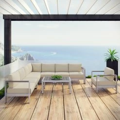 Sunny salutations from the Modway Shore Aluminum 7 Piece Patio Sectional Sofa Set, your answer to nature’s vagaries and your own need for outdoor relaxation. Anodized aluminum forms the extra-strong frames. Cushions have removable, machine washable covers in your choice of color, and you’ll appreciate their softness and ability to resist fading and moisture. The coffee table has a planked top of faux wood in gray. This modular set can be rearranged over and over to suit your fancy, with seating for up to eight of your closest friends and family.
