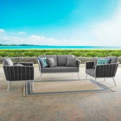 Provide your deck with a breezy Cape Cod touch thanks to the Modway Stance Aluminum 3 Piece Outdoor Patio Conversation Set. This set includes a sofa and two matching armchairs. Powder-coated, rust-resistant aluminum with angled legs (and protective foot-caps). Resin wicker is interwoven into the side panels. For comfort, soft foam cushion are included, upholstered in quick-drying fabric. Choose among the available fabric options to best match your sense of design.