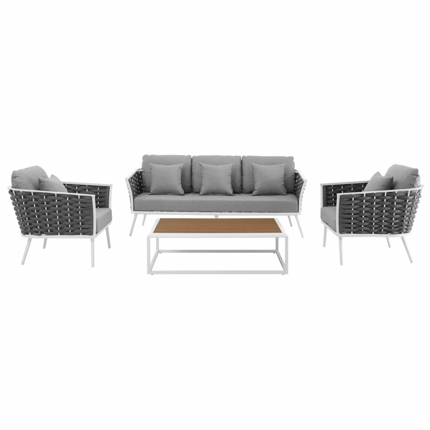 Summer has arrived, and with the Modway Stance Aluminum 4 Piece Patio Sofa Conversation Set you’ll be ready to entertain your friend group. The spacious sofa with its long seat cushion, three back cushions, and three pillows will invite your friends to take a seat and relax. The two chairs will do the same with their matching plush cushions and pillows. Choose from the available cushion and pillow colors to match with your current outdoor area. The sturdy aluminum frames have a polyester fabric weaving that adds intricate detail to the design. The white finish complements the gray fabric. A coordinating coffee table with a slat top completes the set. It features an aluminum construction with a white and natural wood finish.