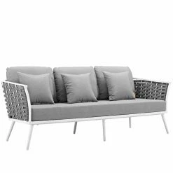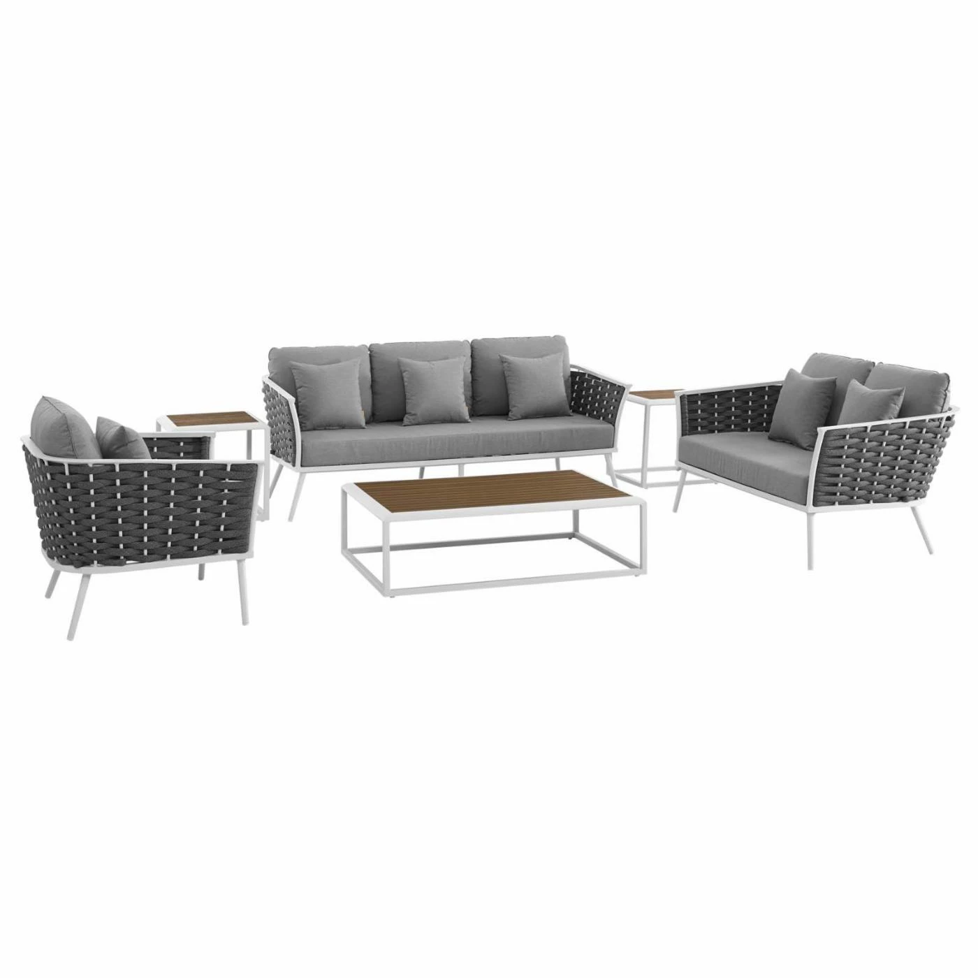 Finally you’ll have room to invite all of your friends and family over with the Modway Stance Aluminum 6 Piece Patio Conversation Set in your backyard. This conversation set includes a sofa, loveseat, and chair constructed with a white aluminum frame and gray polyester fabric weaving. Plush cushions and pillows, in your choice of available color, add comfort to this contemporary outdoor set. The coffee table and two end tables keep drinks and snacks easily within arm’s reach. The slat-top tables are constructed with an aluminum frame in a two-tone, white and natural wood finish.