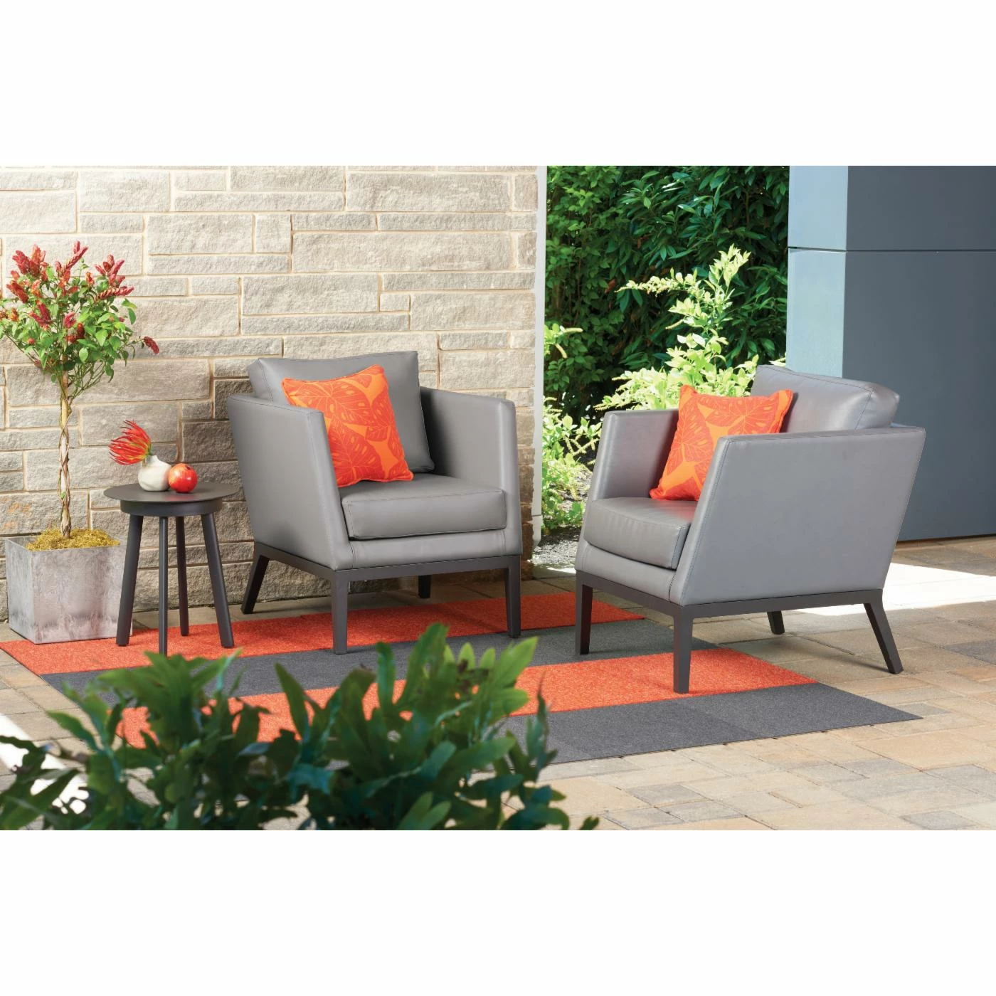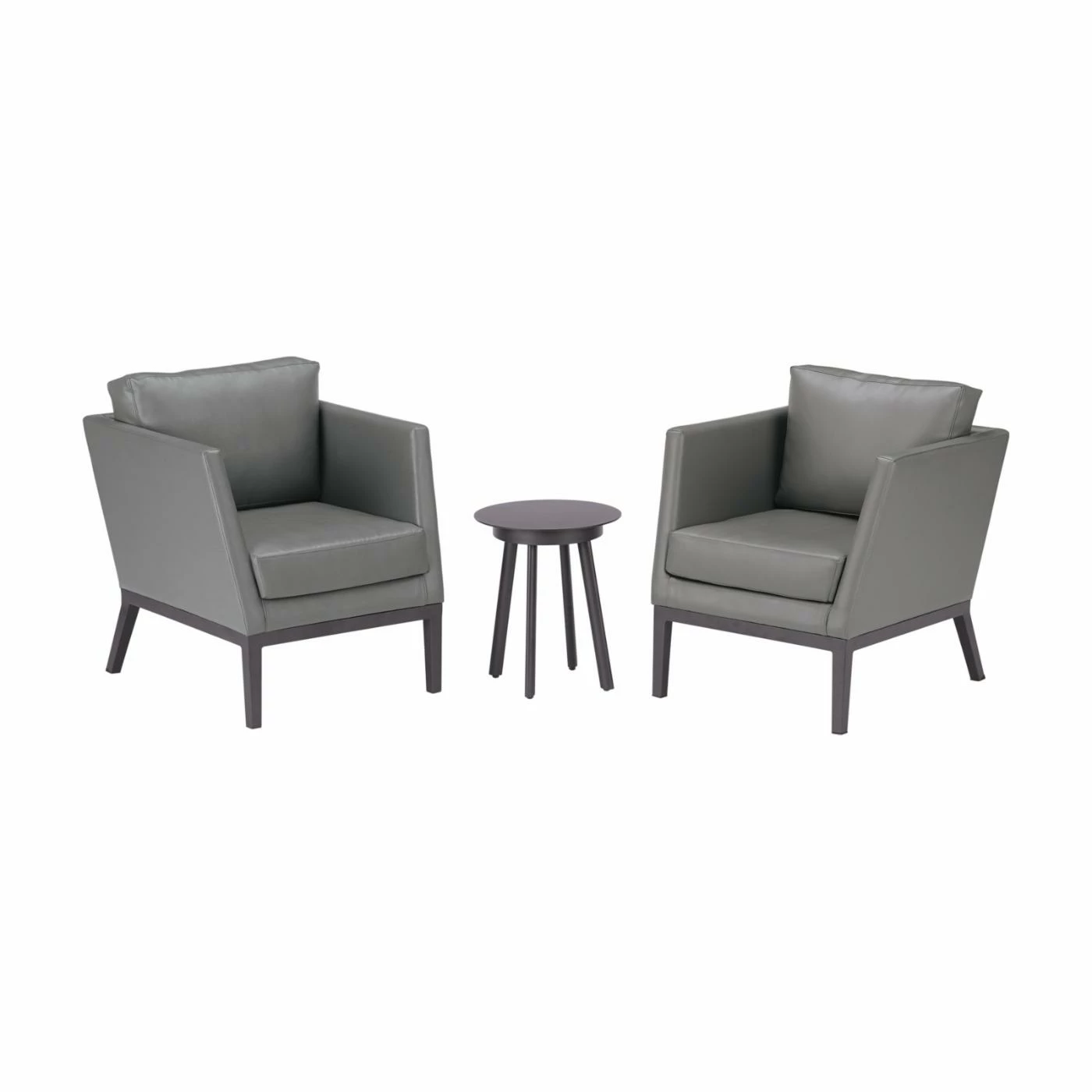 The Oxford Garden Salino Nauticau Faux Leather 3 Piece Patio Chat Set features the durable construction of an outdoor set with the style you would find indoors. Each piece is constructed of powder-coated aluminum. The armchairs feature Nauticau faux leather upholstery in light gray over reticulated foam cushions. The upholstery resists fading, mildew, and stains for long-lasting outdoor use. Remove the detached cushions for easy storage or cleaning.