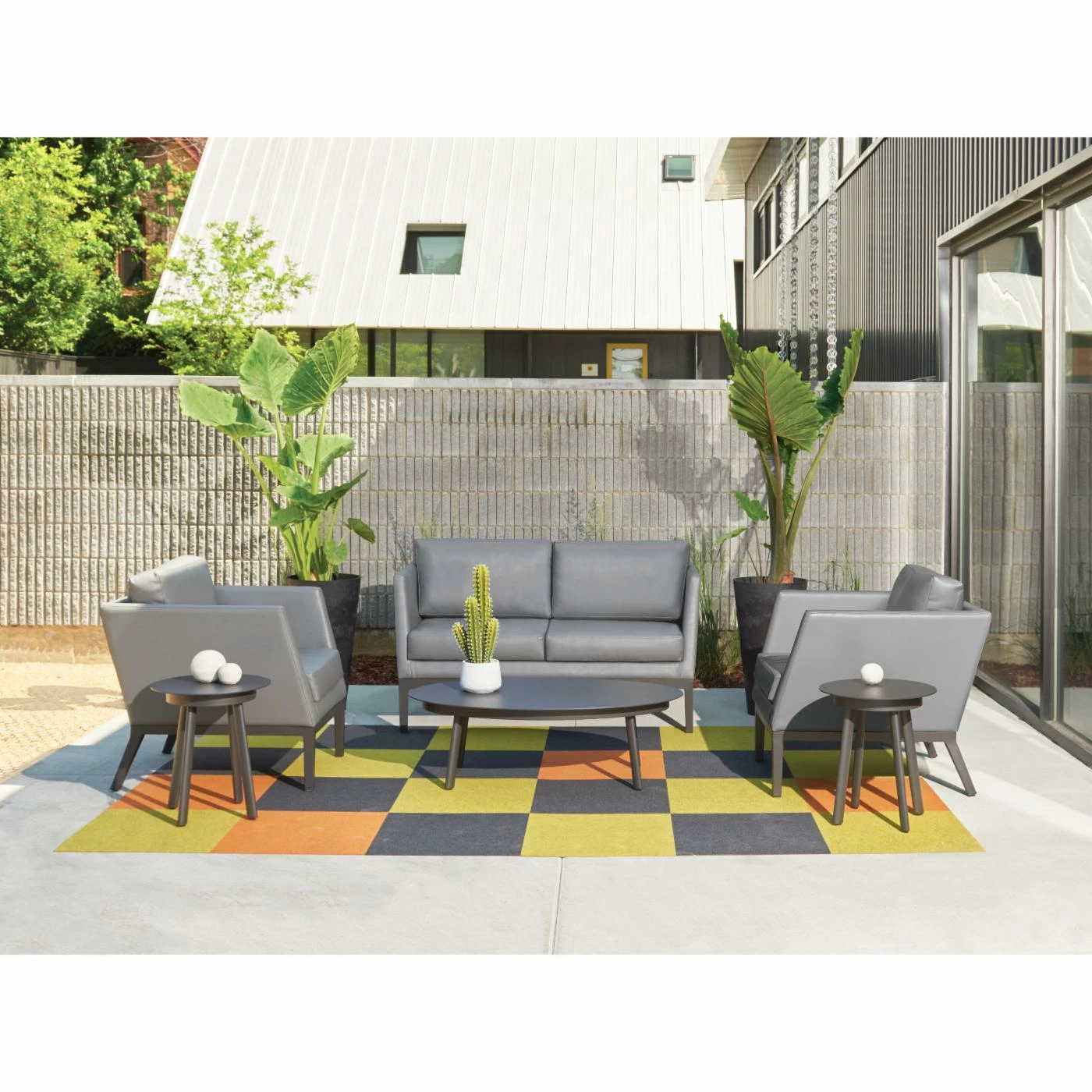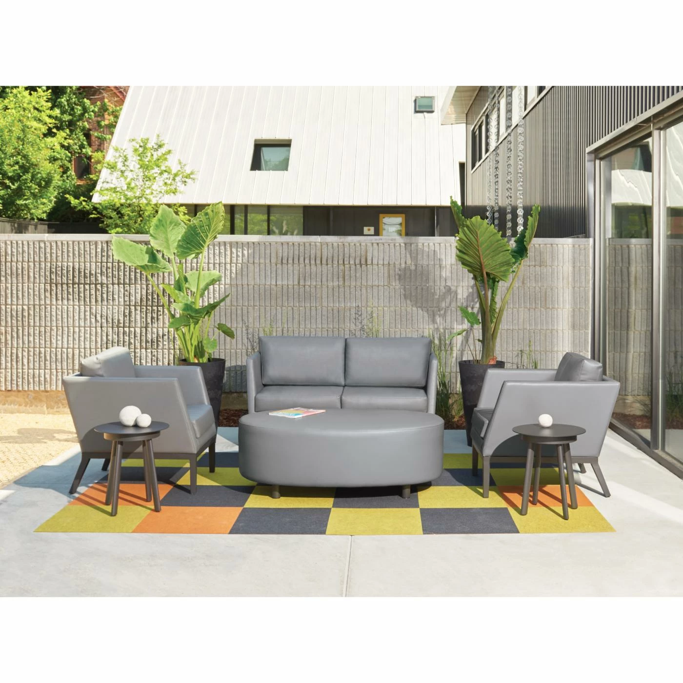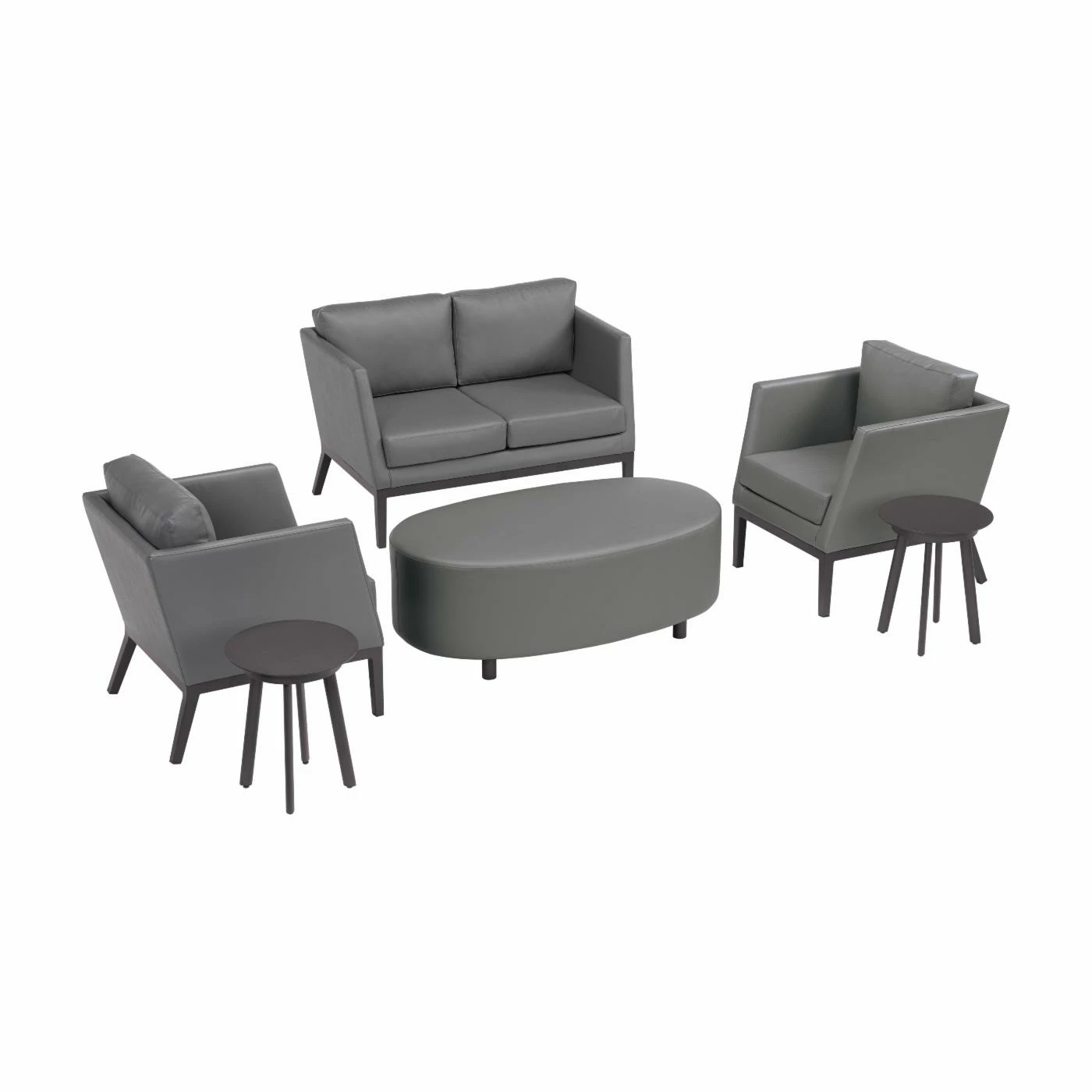 Nickel gray PVC leather upholstery gives the Oxford Garden Salino Nauticau Faux Leather 6 Piece Patio Conversation Set a clean, contemporary look. This set includes a loveseat, two armchairs, two round end tables, and an oval coffee table. Choose from the available coffee tables. Each frame is durably constructed of powder-coated aluminum and supported by slim legs with end caps. Nauticau faux leather upholstery is weather-resistant for long-lasting use. For storage or easy cleaning, the cushions are removable.