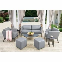 The clean, classic look of leather can be used to style your outdoor space with the Oxford Garden Salino Nauticau Faux Leather 8 Piece Patio Conversation Set. This set includes a loveseat, two armchairs, and two ottomans for seating. Two small, round end tables and an oval coffee table will hold snacks and drinks. Choose from the available coffee table options. The seats and ottomans are upholstered with Nauticau faux leather upholstery in nickel gray. Nauticau PVC will withstand extreme temperatures, fading, stains, and water damage. The quick-drying cushions feature reticulated foam cores and vented bottoms for drainage. Remove the detached cushions for easy cleaning or storage.