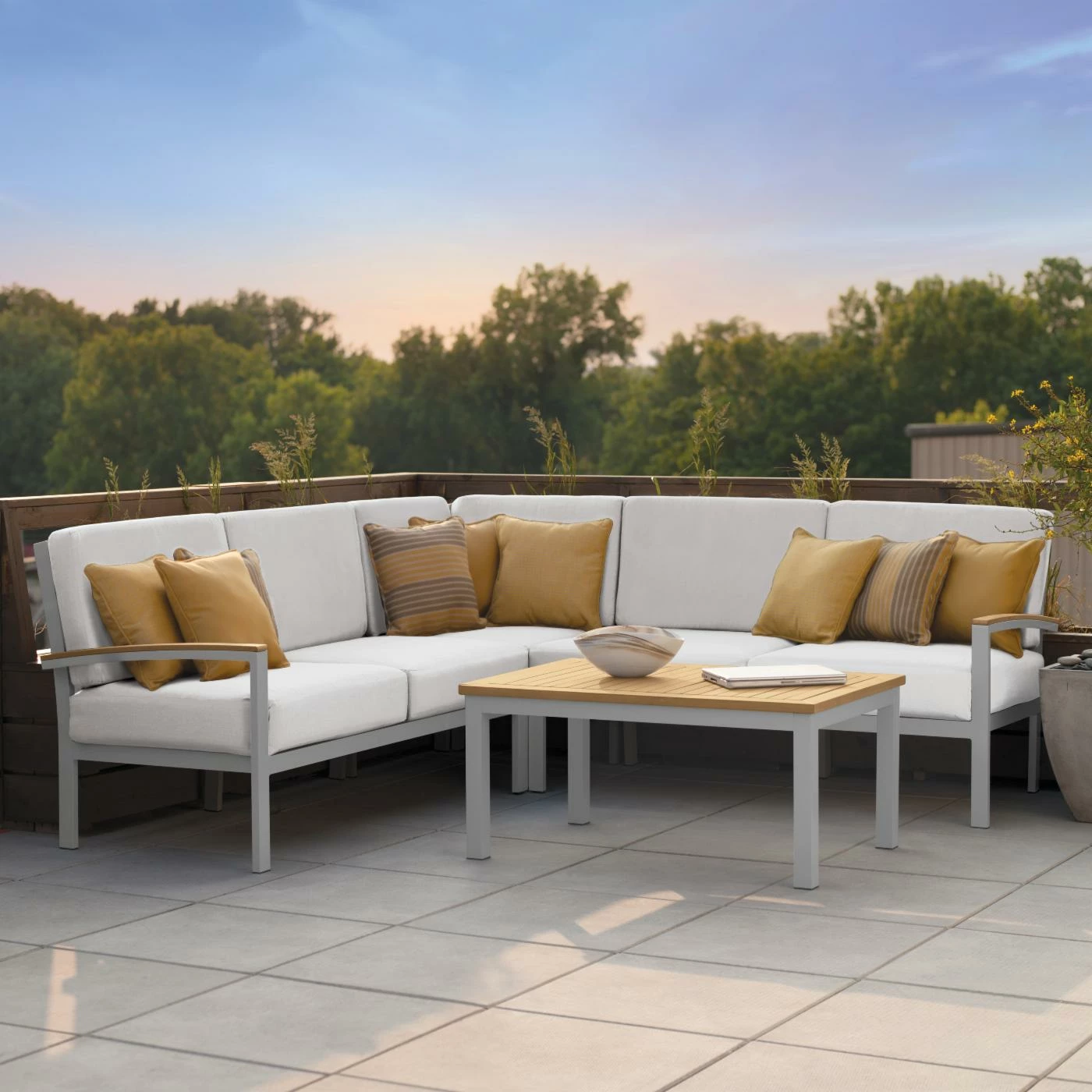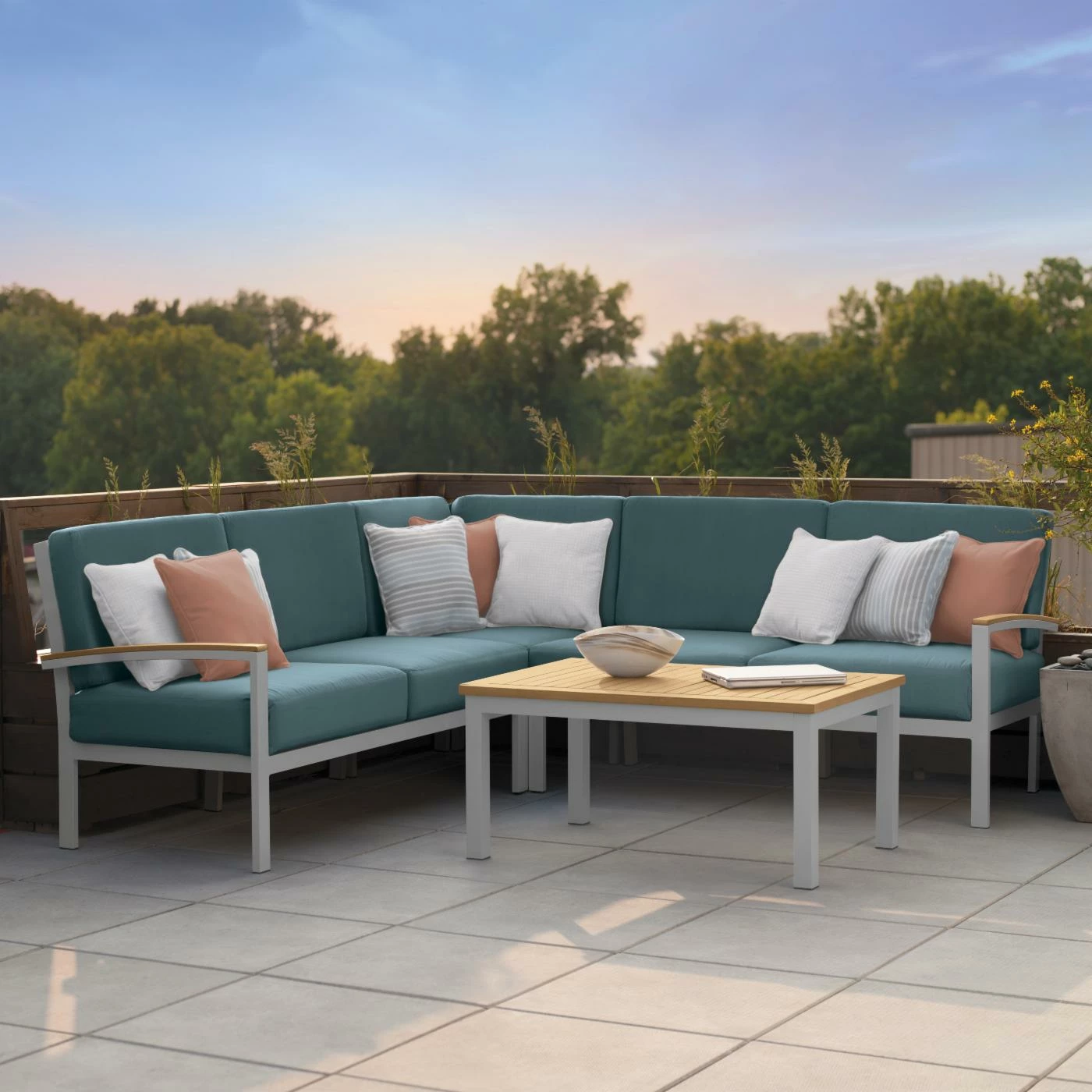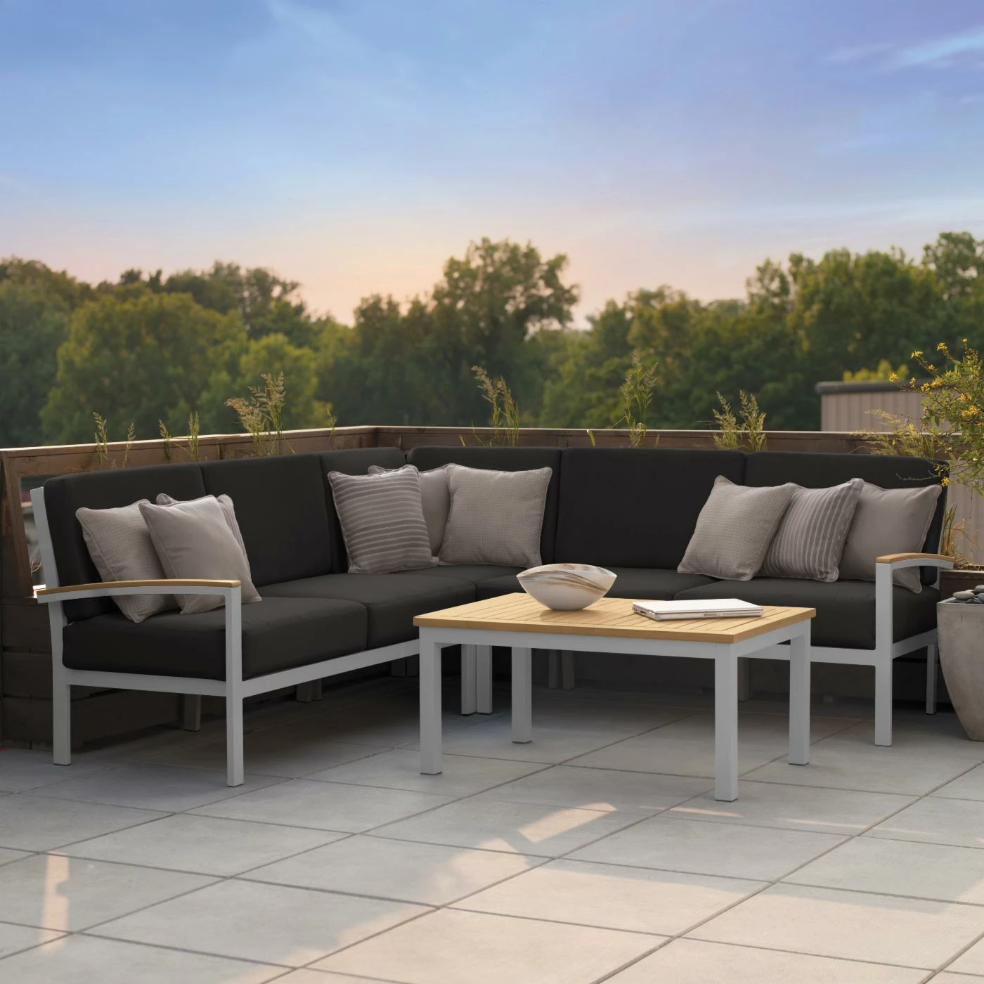 From its summery style to its premium materials, the Oxford Garden Travira Tekwood and Aluminum 4 Piece Loveseat and Coffee Table Chat Set will be a welcome addition to your outdoor living area. Including two loveseats, a corner seat, and coffee table, this chat set can seat up to five. The frames are crafted of lightweight, rust-proof aluminum with a protective powder coat flint, while both the arms and coffee table’s top are made of Tekwood, a wood alternative derived from polystyrene that offers the look of wood without the maintenance. The water-resistant foam cushions come complete with solution-dyed acrylic covers, while leg end caps help prevent your floors from scuffing and scratching. You’ll get to choose from available frame finishes and cushion colors, so it’s easy to create a custom look that’s just right for your patio or porch – and summer.