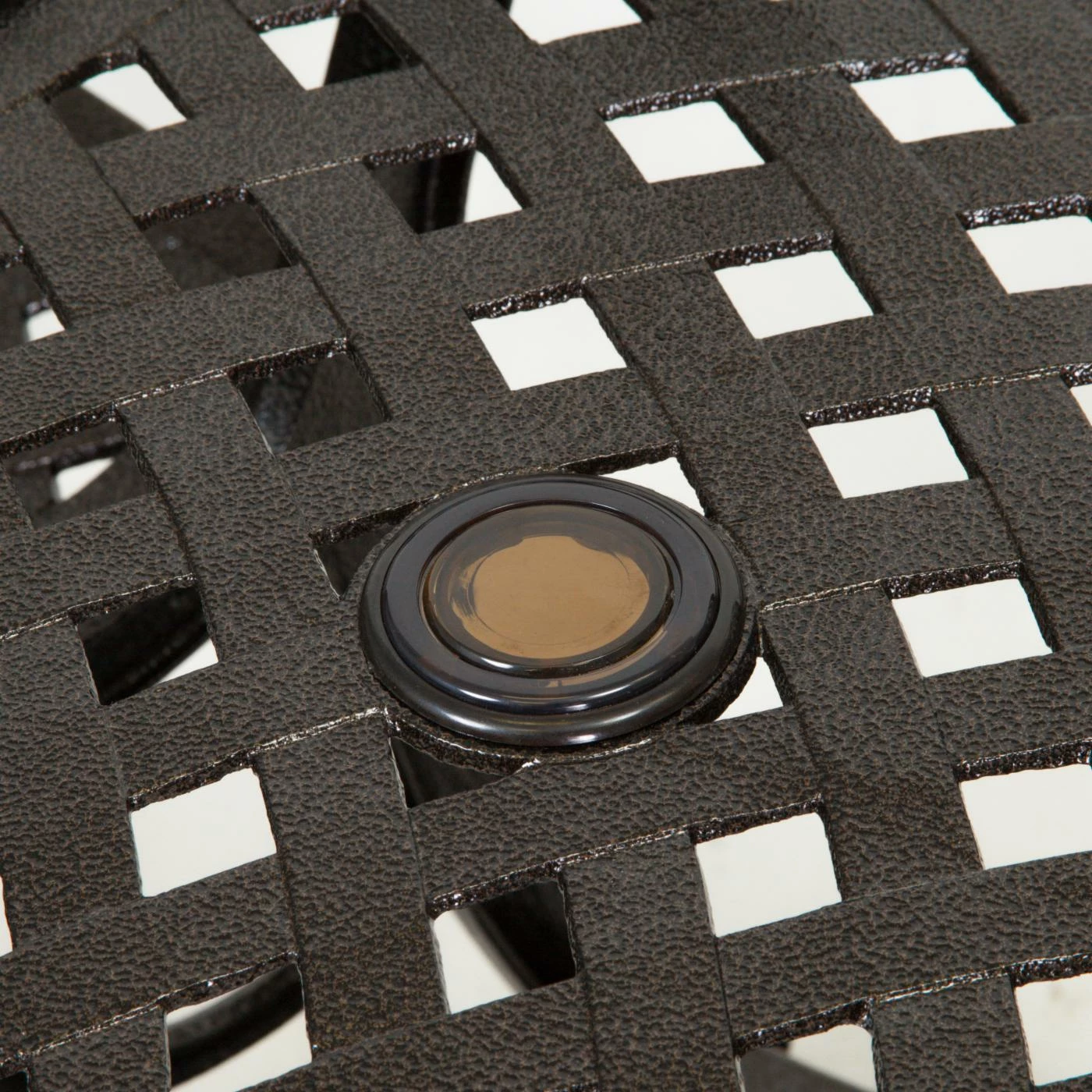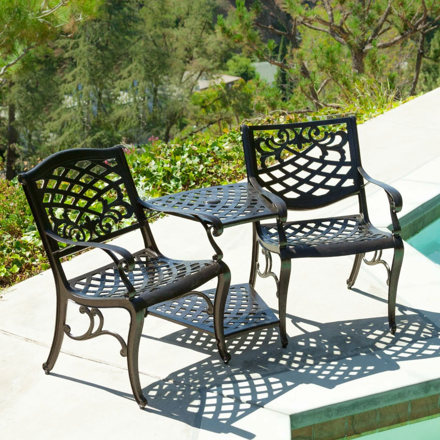 The Sarasota double chair is a beautiful and unique addition for your outdoor decor. Made from cast aluminum, this piece is made up of two chairs conveniently attached to a center table. The features include intricate details on the chair and table, and an umbrella opening on the table. The antique bronze finish is neutral to match any outdoor furniture and will hold up in any weather condition. Whether in your backyard, patio or deck, you’ll enjoy this piece for years to come.