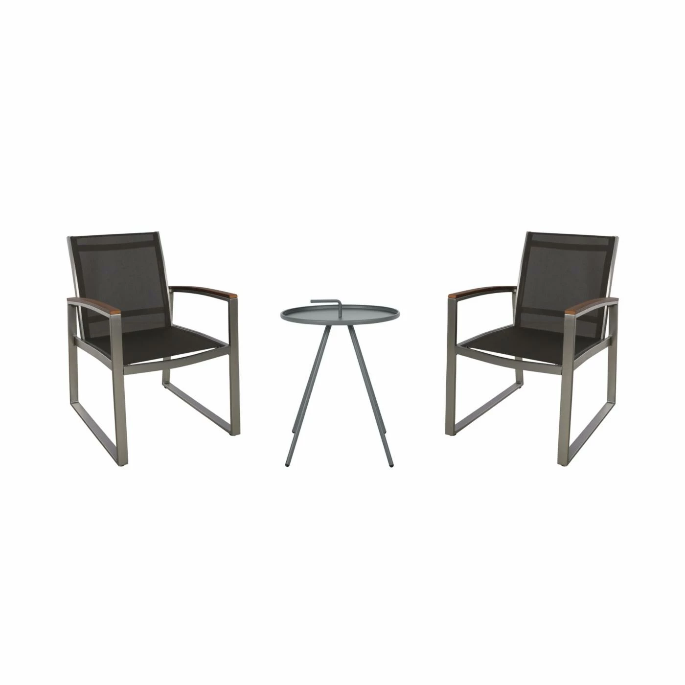 Treat your backyard or patio space to a cozy, relaxing corner with the help of our three-piece chat set. This chat seat offers two chairs made of brushed aluminum frames and a side table made of steel. The chairs are finished with breathable mesh seating and are topped with faux wood accents to enliven its design. Featuring a unique construction, this chat set will not only offer your outdoor space a stylish upgrade but will also provide incredible comfort, making this perfect for any home. ;