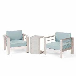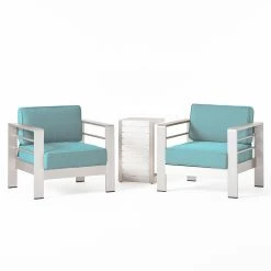 Complete your patio with this perfect set of 2 club chairs and a c-shaped standing table. Place the table between the two chairs and everyone can have a place to put their mimosas while the conversations flow. Made with top quality aluminium and extra plush water resistant cushions you canโt go wrong with this set.