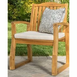 This outdoor chat set has been uniquely paired for your convenience. With two cushioned wooden chairs, this set is both unique and comfortable. With water resistant fabric, the cushions are not only comfortable, but will also hold up under use. The table is made with sturdy wicker that is great for outdoor use and will be perfect for anything you want to use it for.