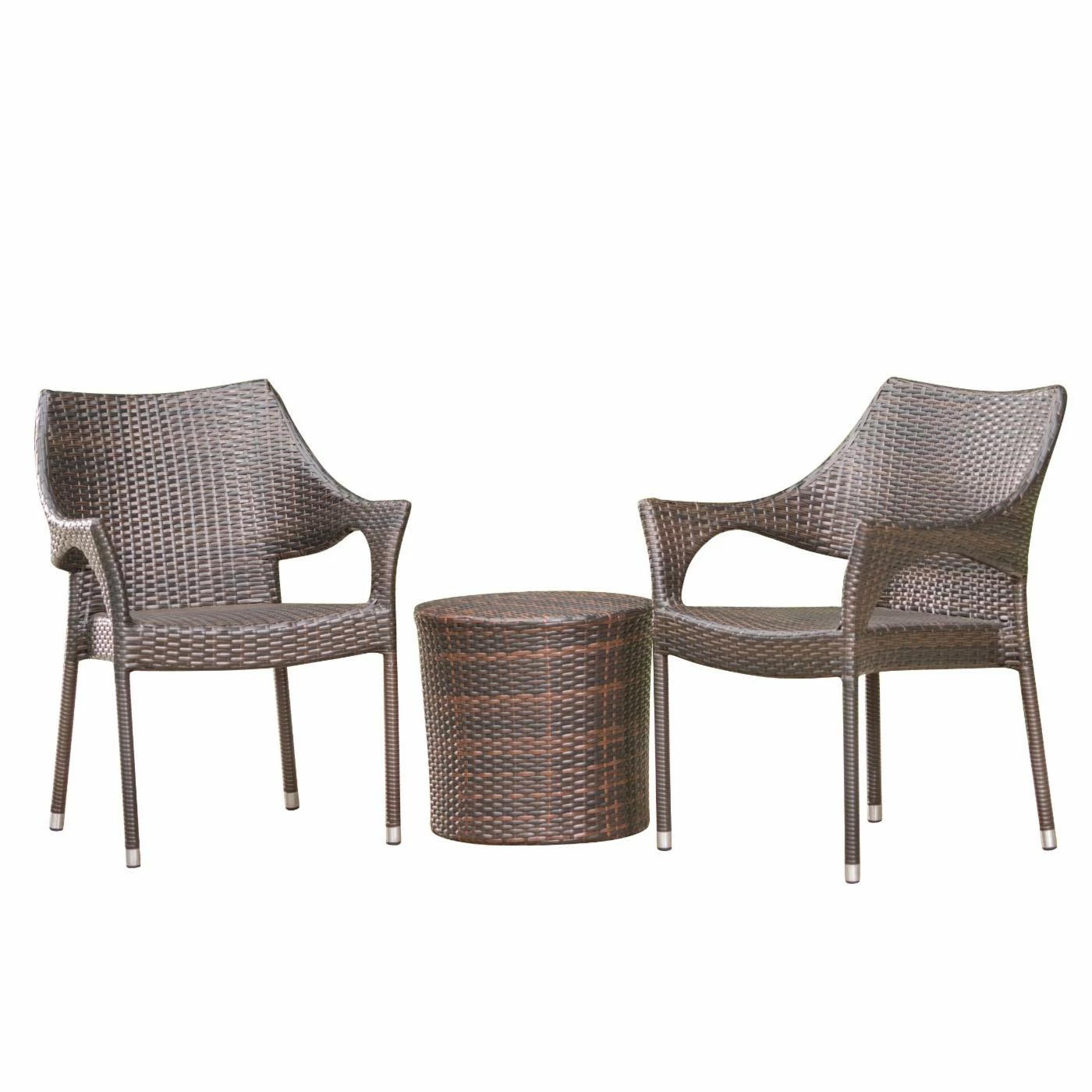 This outdoor chat set has been uniquely paired for your convenience. With two stacking wicker chairs, this set is both unique and comfortable. The stacking feature of the chairs allows you to easily store these chairs and the table in one place when you need this set out of the way. The table is made with sturdy wicker that is great for outdoor use and will be perfect for anything you want to use it for.