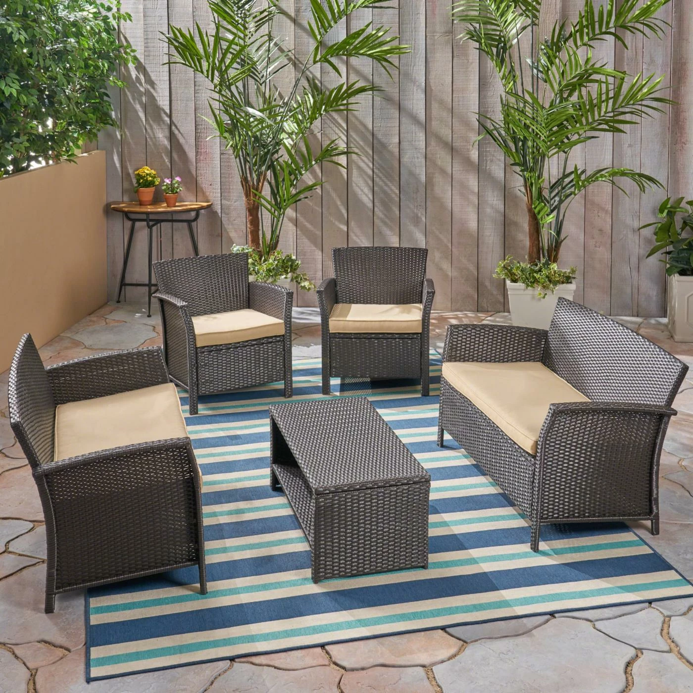 Best Sale โค๏ธ Best Selling Home Decor Resin Wicker Patio Sets Kenza Outdoor Wicker 6 Seater Chat Set With Cushions – Brown And Tan ๐