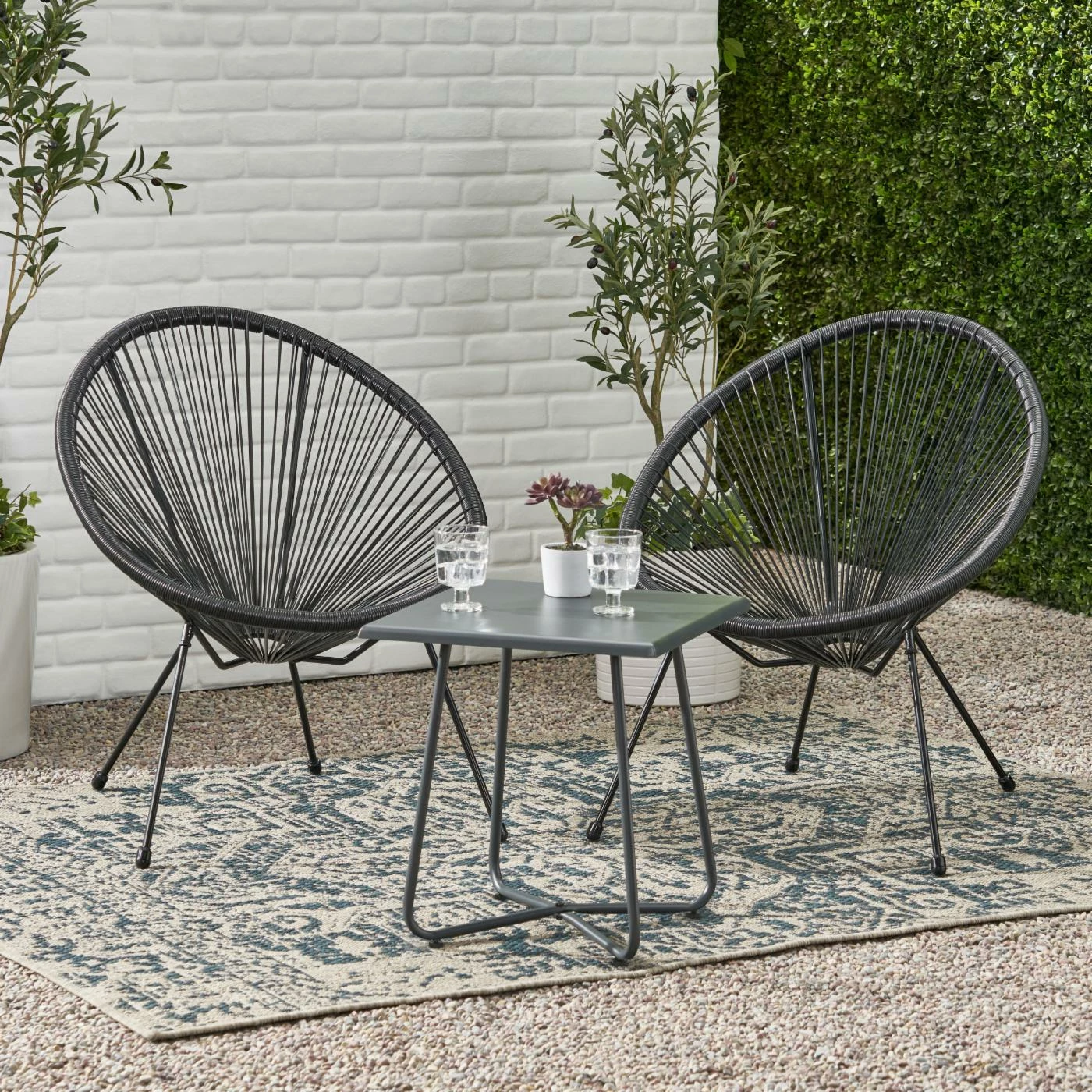 Start your summer with a bang by soaking up the warm sun with good company and a refreshing drink. Bringing a bold and stylish element to your dรฉcor, our three-piece seating set will provide your outdoor space with ultimate comfort. Featuring a charming side table and two chairs that are created with a delightful hammock weave, this set provides a modern look to your home. This delightful piece is made to last with its weather-resistant construct and durable structure, making this a perfect addition.