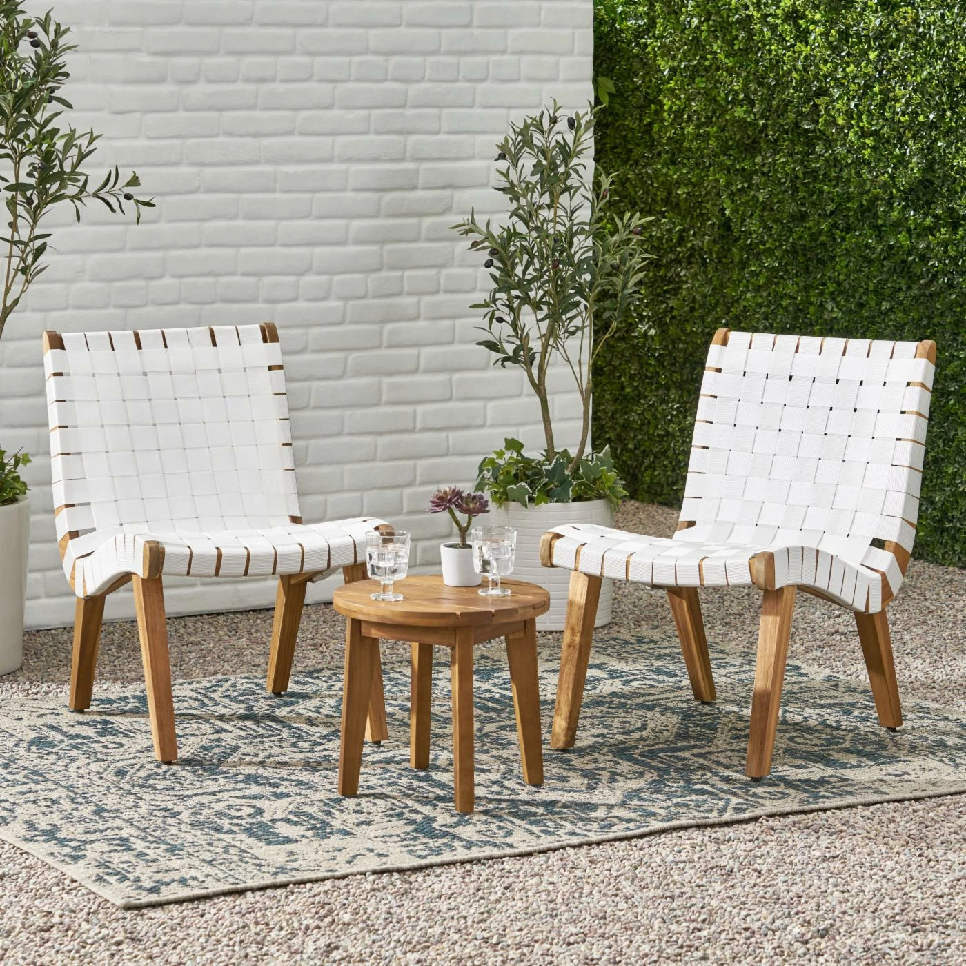 Add a classic touch to your outdoor space with a modern twist, making your backyard or patio the perfect lounge area. Combining a stunning rope strap weave and highly durable acacia wood, our chat set will be a flawless addition to any outdoor lounge space. With curvaceous seating and a slat-top table, this chat set will have no problem blending into your outdoor decor with its modern style and incredible durability. Lean back in our ergonomic seating and enjoy the great outdoors as it is meant to be enjoyed.