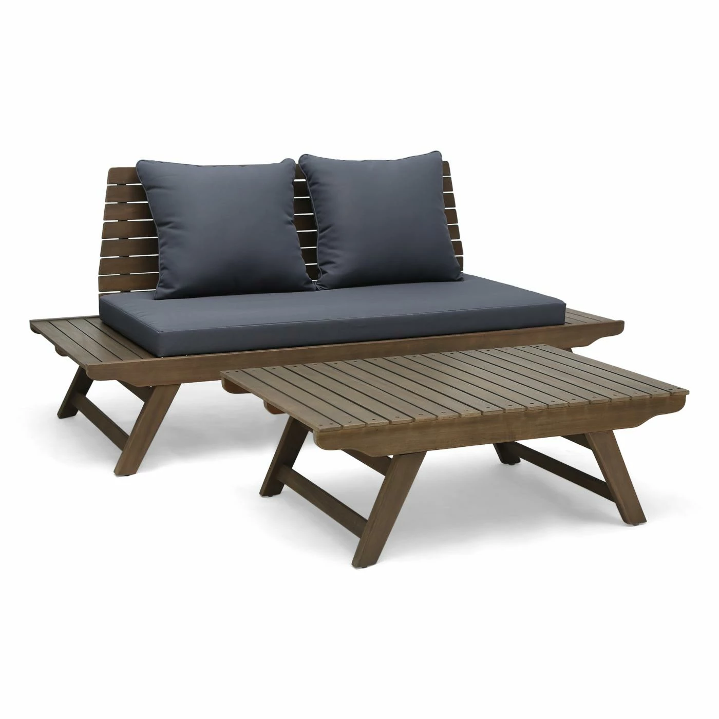 Bring home the perfect addition to your patio or deck space with a set that provides unparalleled design and comfort for your outdoor decor. Featuring a wide seat panel and legs that angle outwards, our loveseat and coffee table set will be a flawless addition to any backyard or patio. This wing-like structure offers extra space on either side of the seat cushion for a unique design. With solid acacia wood frames and plush outdoor cushions, this set offers hours of conversation for you and your guests.;