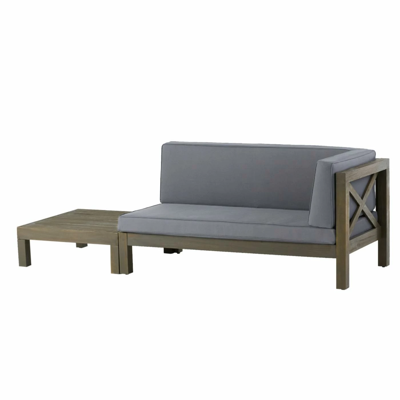 Turn your outdoor space into a place of ultimate comfort by bringing home a seating set that makes relaxation easy. Our exquisite right-armed loveseat and coffee table set brings together rich cross-back acacia wood frames and slat paneling to create a breezy and comfortable space for your patio or backyard space. Finished with plush outdoor cushions and a slat panel coffee table, this set will have no problem blending into your outdoor decor with its modern style and incredible durability.
