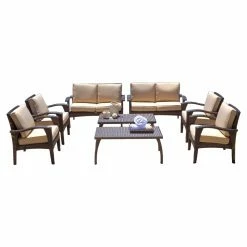 The wide, arching armrests on this Ashly Wicker 8 Piece Patio Conversation Set look inviting, and they deliver. Thereβs room for eight people to settle into those thick tan fabric cushions and enjoy the slight recline. The dark brown resin wicker is outdoor friendly. This grand set includes two matching loveseats, four chairs, and two coffee tables that you can mix and match in endless combinations, together or in groups.