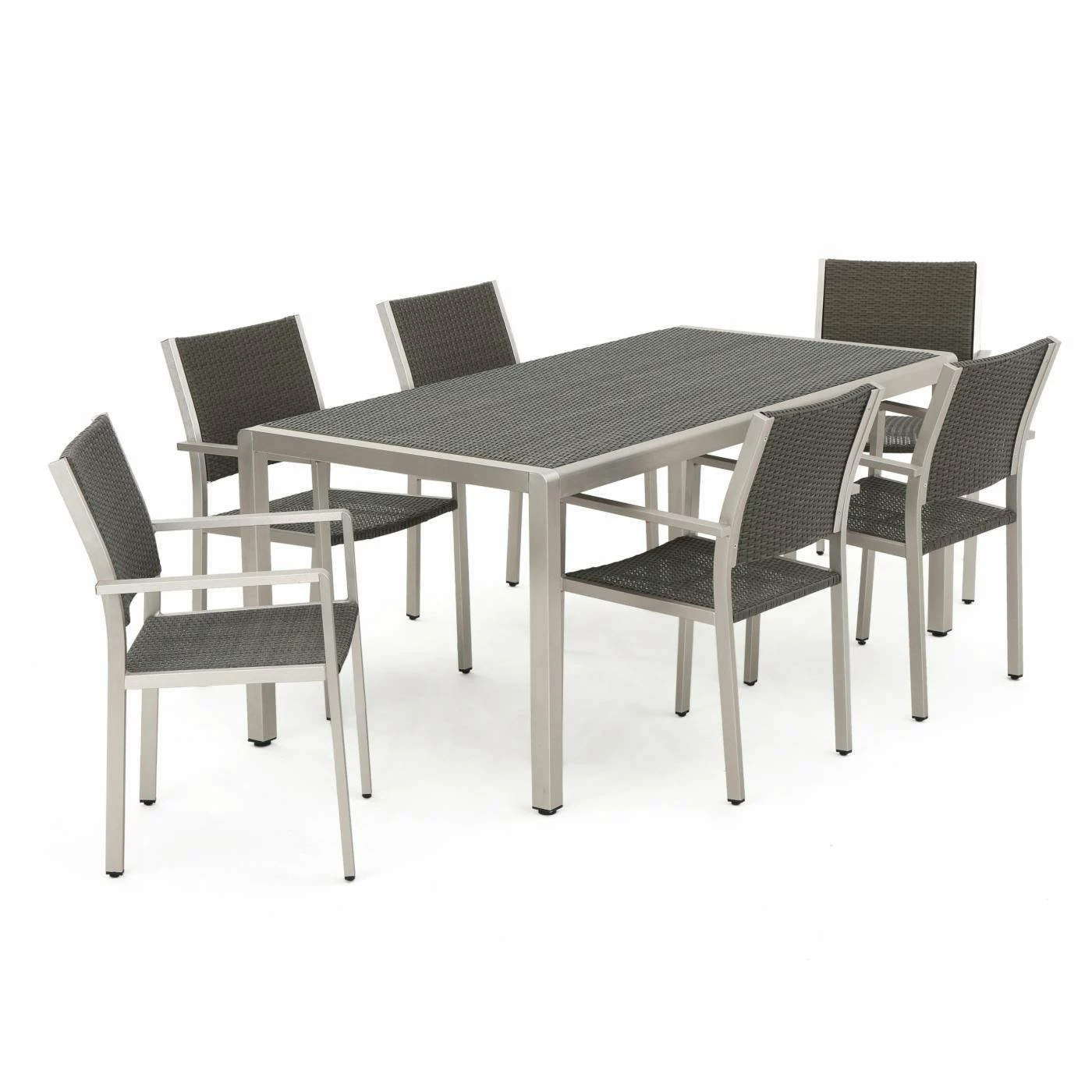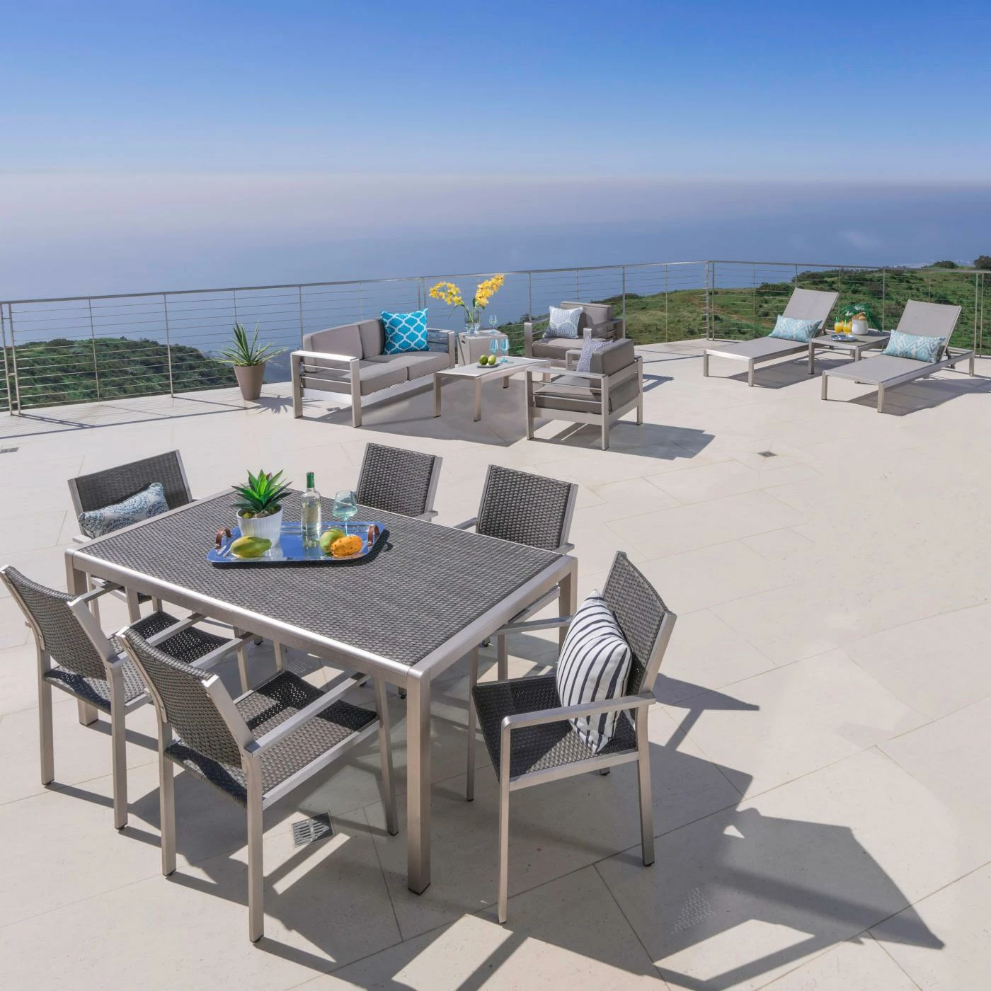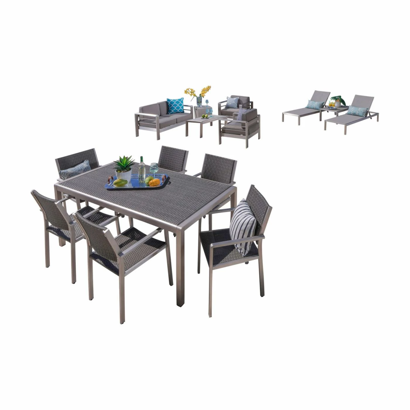 You won’t have to limit your guest list with the Cape Coral Wicker 13 Piece Patio Dining and Conversation Set with Chaise Lounges. This patio set includes a place to dine, lounge, and chat. Each piece in this set is durably constructed for long-lasting outdoor use. Aluminum frames in a silver finish are topped with mesh chaise lounge seats, polyester cushions, and resin wicker dining chair seats and backs. Squared designs and neutral colors give this set a modern look.
