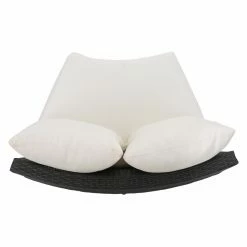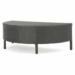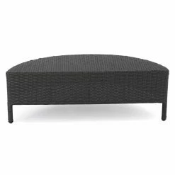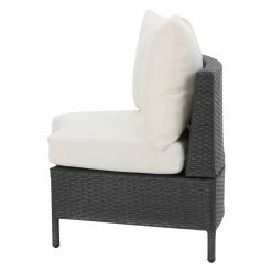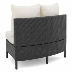With this Eta 5 Piece Patio Wicker Sofa Set with Water Resistant Fabric Cushions, your outdoor entertaining area will feel like a five-star tropical resort. This set includes five curved two-seater sofas that fit together to create a half-moon shaped lounge. The matching demilune table can be nestled inside or out for more leg room. The frames are made of durable iron wrapped in gray polyethylene rattan wicker. Comfort lives in the thick, bright white water-resistant cushions.