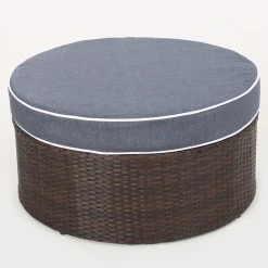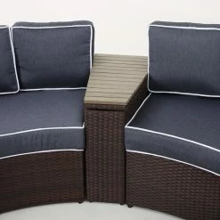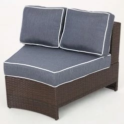 Delight your backyard guests with the Madras Tortuga Wicker 8 Piece Outdoor Conversation Set. Cool blue, water-resistant fabric cushions provide spacious seating for six while the included wedge tables provide added storage and functionality. Relax and put your feet up on the ottoman as you converse with friends and family. All-weather construction ensures this outdoor conversation set will be with you for years.