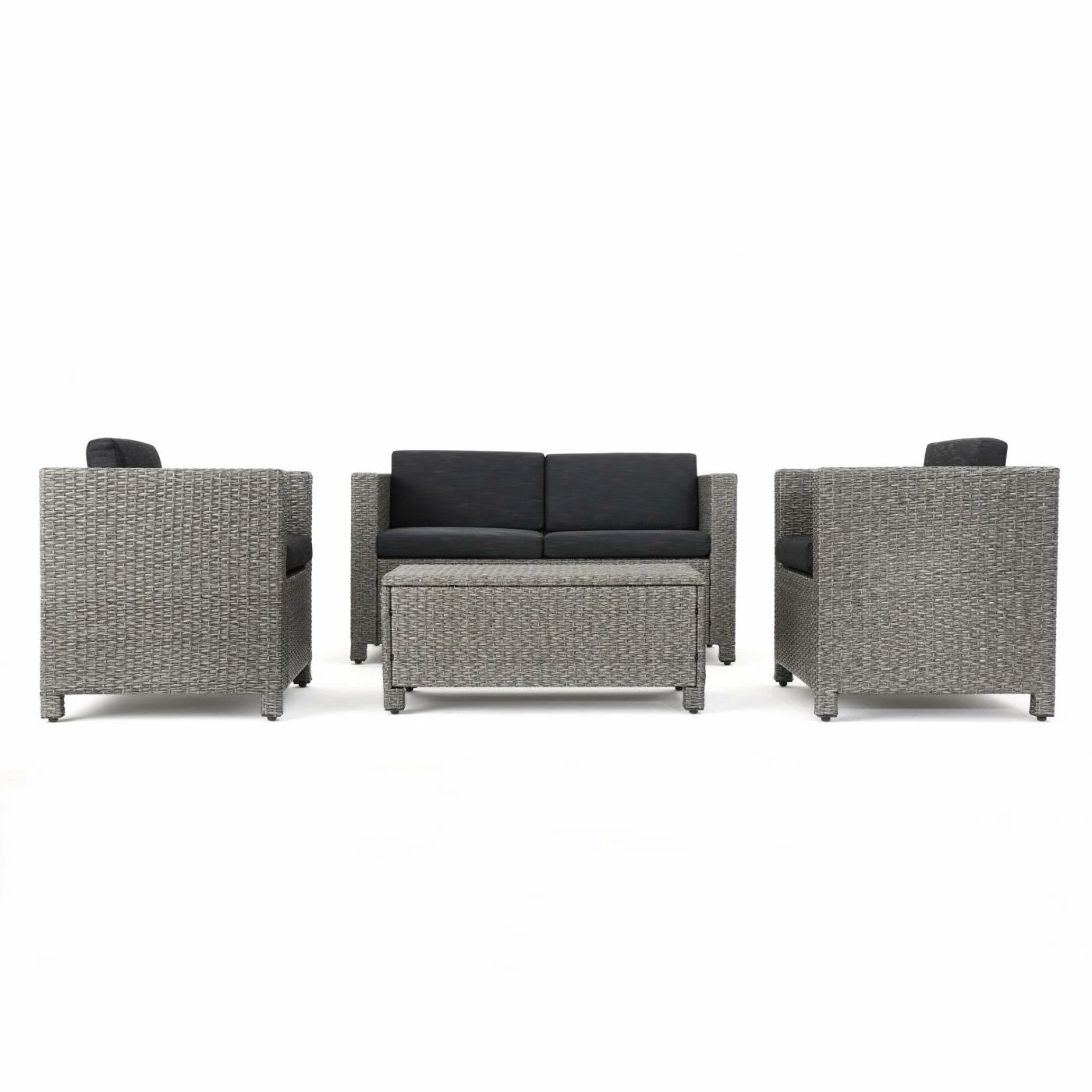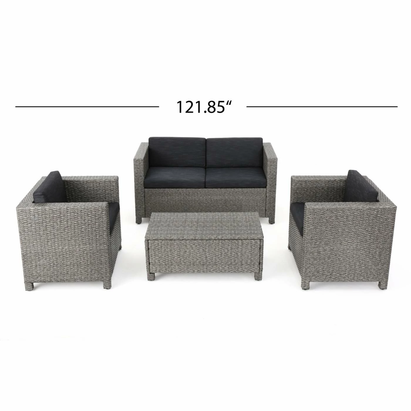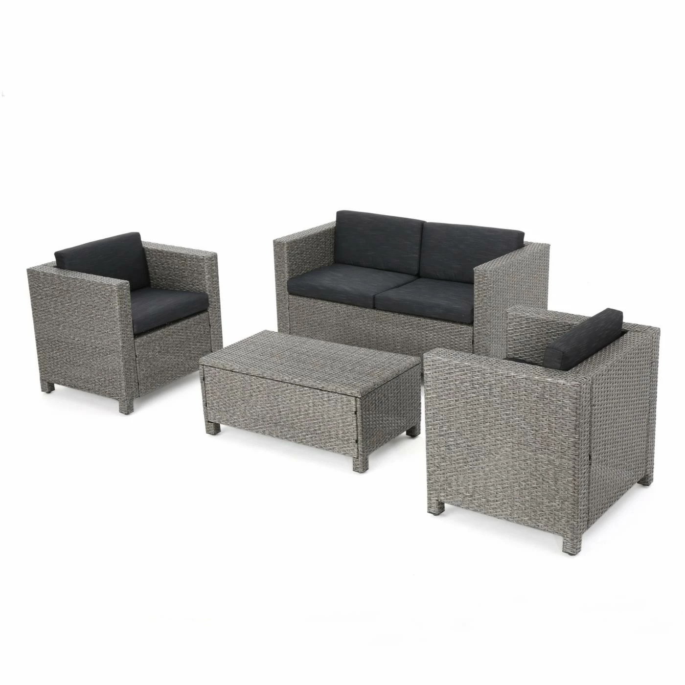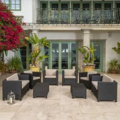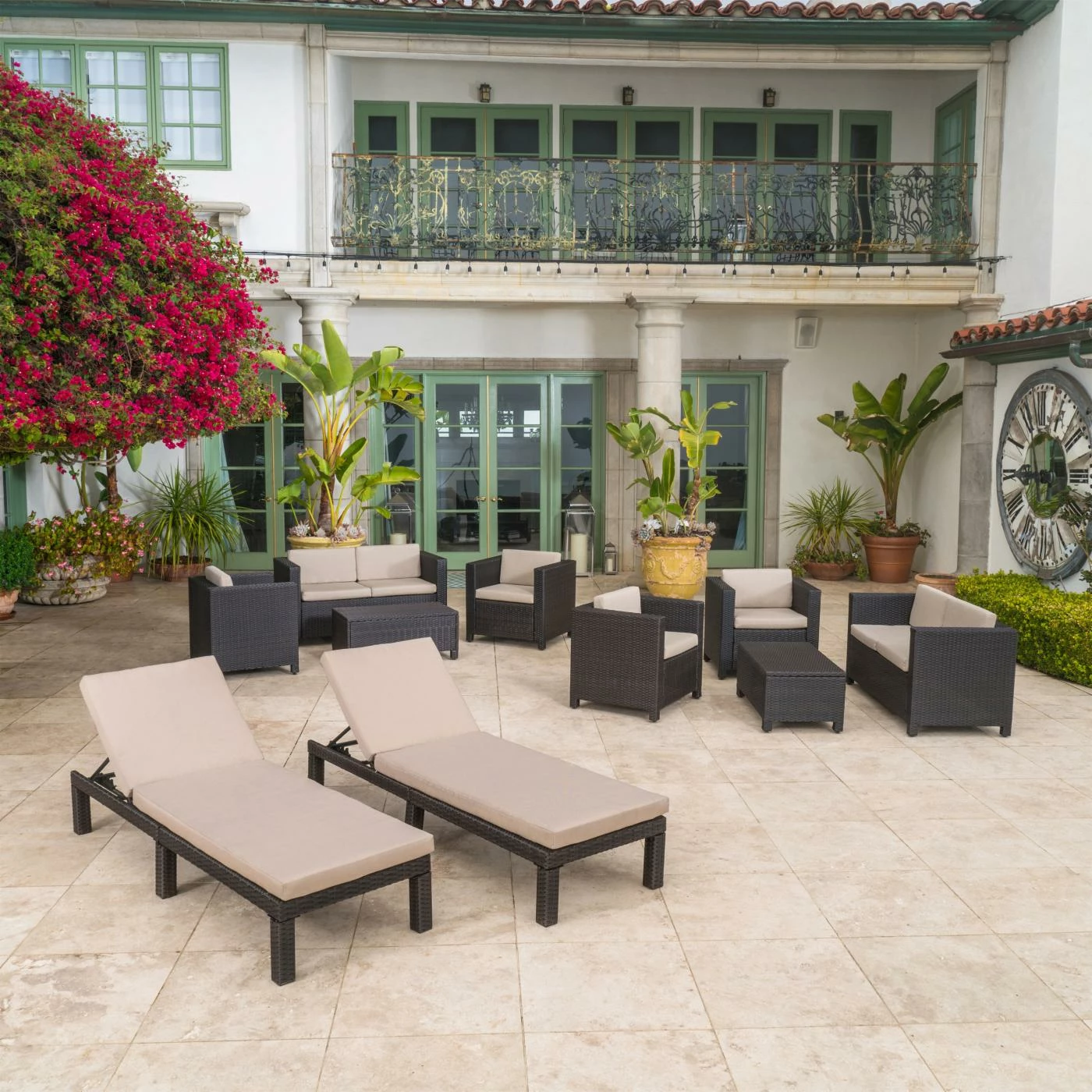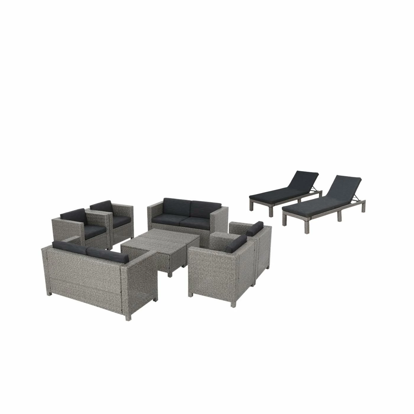 You’d better get some fancy flip-flops for entertaining, because people are going to want to come over and hang out on the Puerta Wicker 10 Piece Patio Conversation Set. This expansive set could easily transform an empty porch or patio into a chic, on-trend oasis. It includes two chaise lounges, two loveseats, four chairs, and a pair of matching coffee tables. Each piece has a frame of powder-coated steel with an exterior of woven resin wicker. Resin wicker looks and feels like organic wicker, but its synthetic composition makes it naturally resistant to rot, cracking, and fading. The cushions water-resistant cushions are covered with polyester fabric that complements the gray tones of the resin wicker. The chairs and loveseats offer a modern shape with wide, flat arms and a high back. The chaise lounges give you a wide bed with an adjustable backrest that offers multiple positions for reading, sunbathing, or lying down. Please choose from available color options.