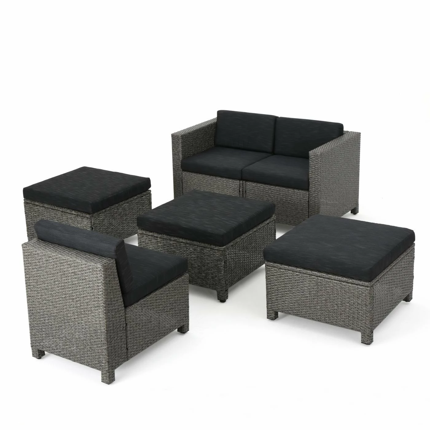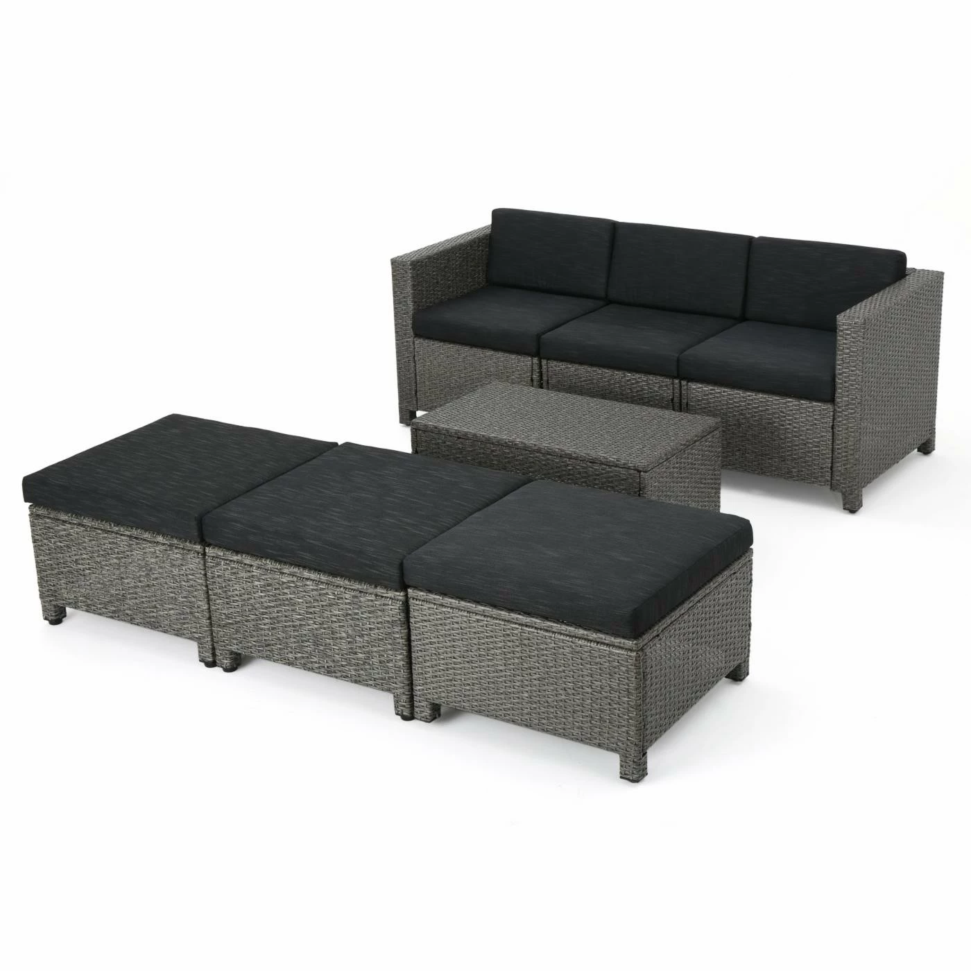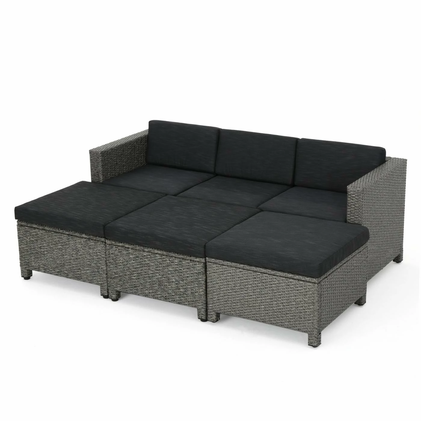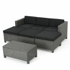 Get ready for some serious lounging on the Puerta Wicker Patio Sofa. This set includes a left-handed and right-handed chair with an armless chair in the middle and three matching ottomans. You could easily spread them out to create a cozy conversation space, or you can put them all together and give yourself a spacious, contemporary daybed. Squared, modern lines are standard, and they have each piece crafted with a frame of powder-coated steel. The steel is fully covered by woven resin wicker, a material that looks and feels like traditional wicker, but offers up the weather-resistance of a synthetic product. The all-weather cushions are covered with dark gray polyester fabric that’s ready for a life outdoors.