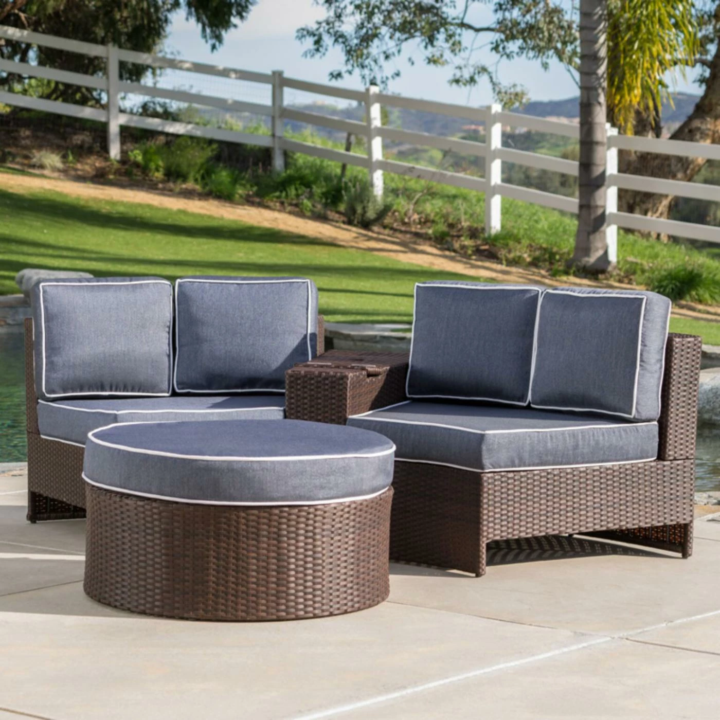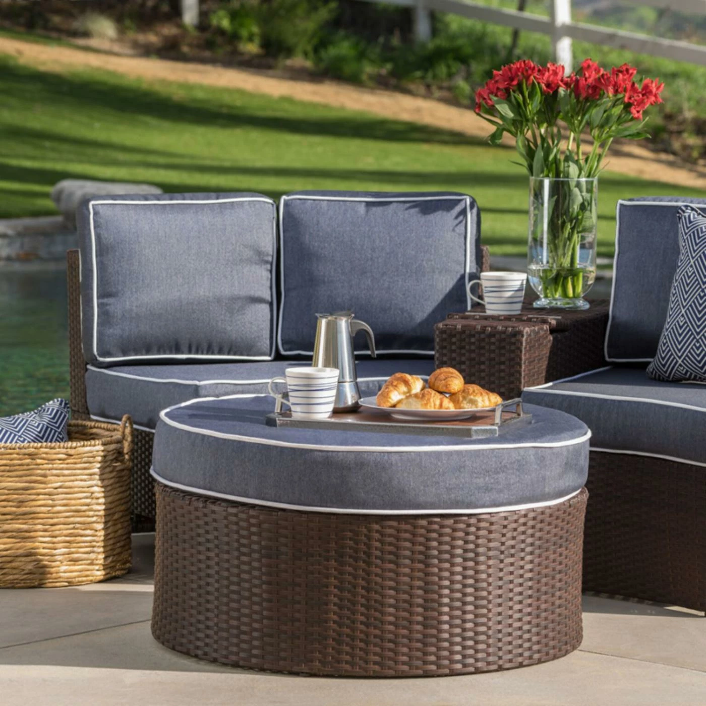 Summer nights can be even more relaxing with the Seychelles Wicker 2 Piece Patio Sectional Conversation Set. Constructed of aluminum woven in polyethylene wicker, this set ensures longevity and a sturdy foundation. The polyester-blend cushions make it as if you’re sitting on a cloud, and are water resistant so morning dew or rain isn’t an issue. Nice cold refreshments can be easily reached as the ottoman can come with or without an ice bucket. Easily store your refreshments in the ottoman’s hidden cup holders. Shade can be conveniently provided as the ottoman also features a two-inch umbrella hole for a cool break from the sun. In off seasons or anytime you don’t want to use this set, easily detach the cushions for manageable storage.
