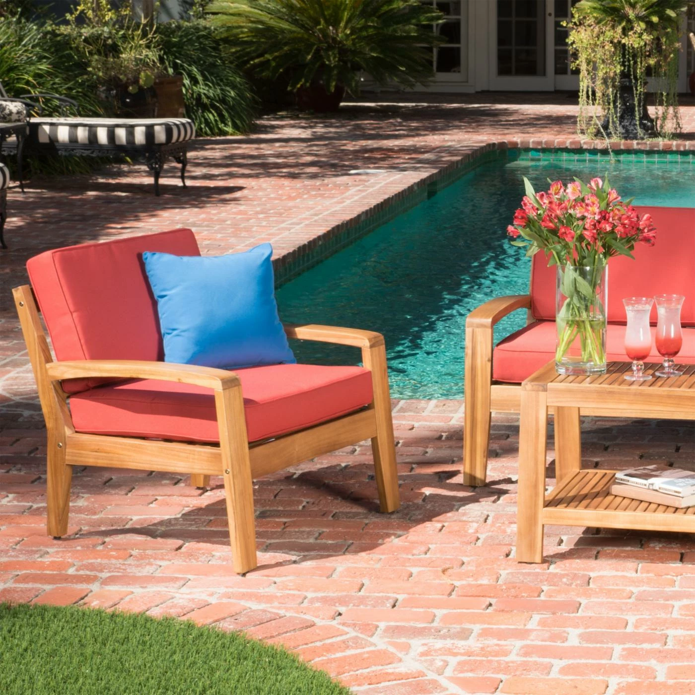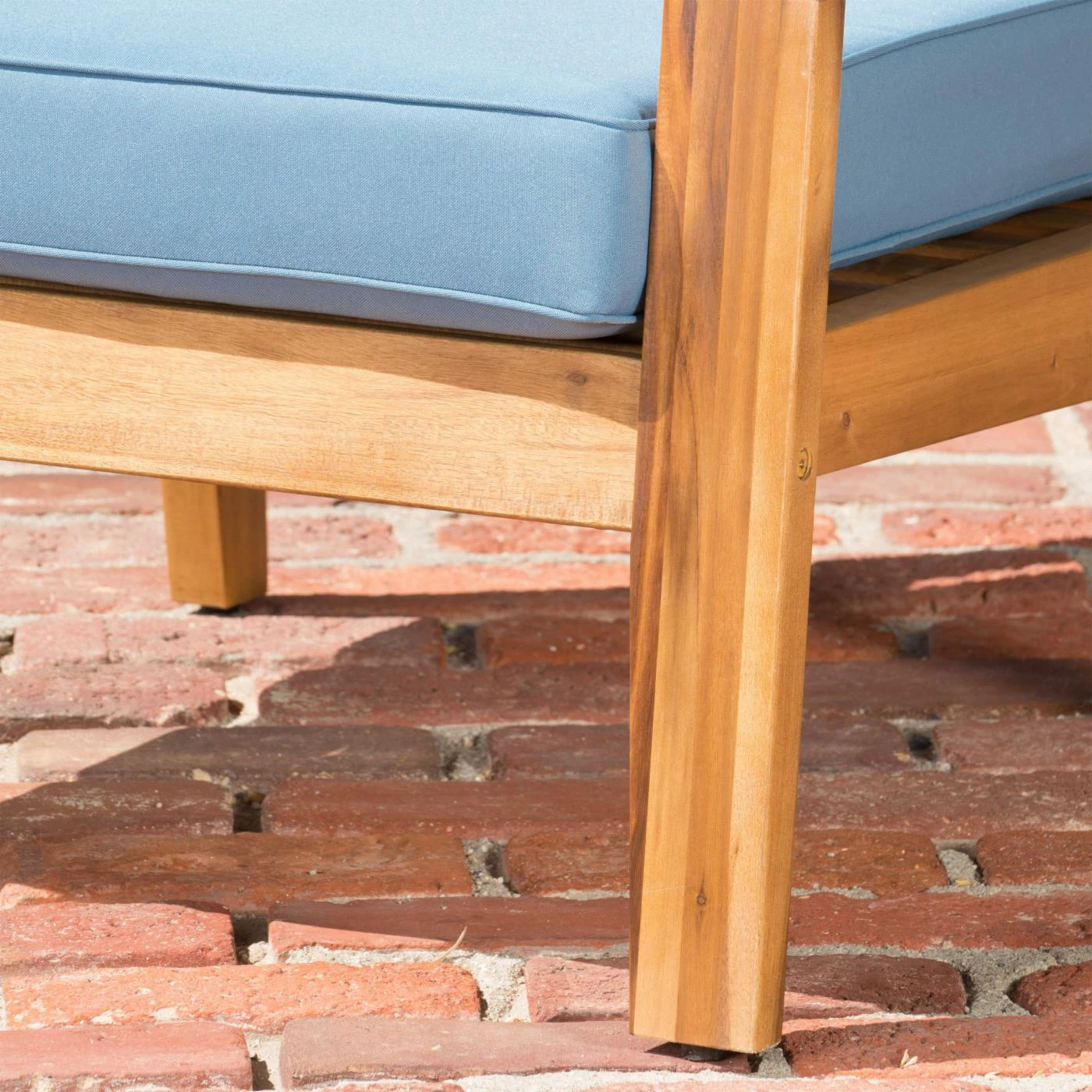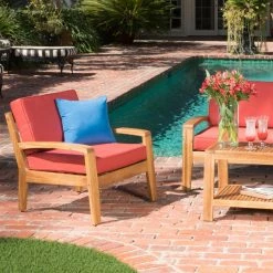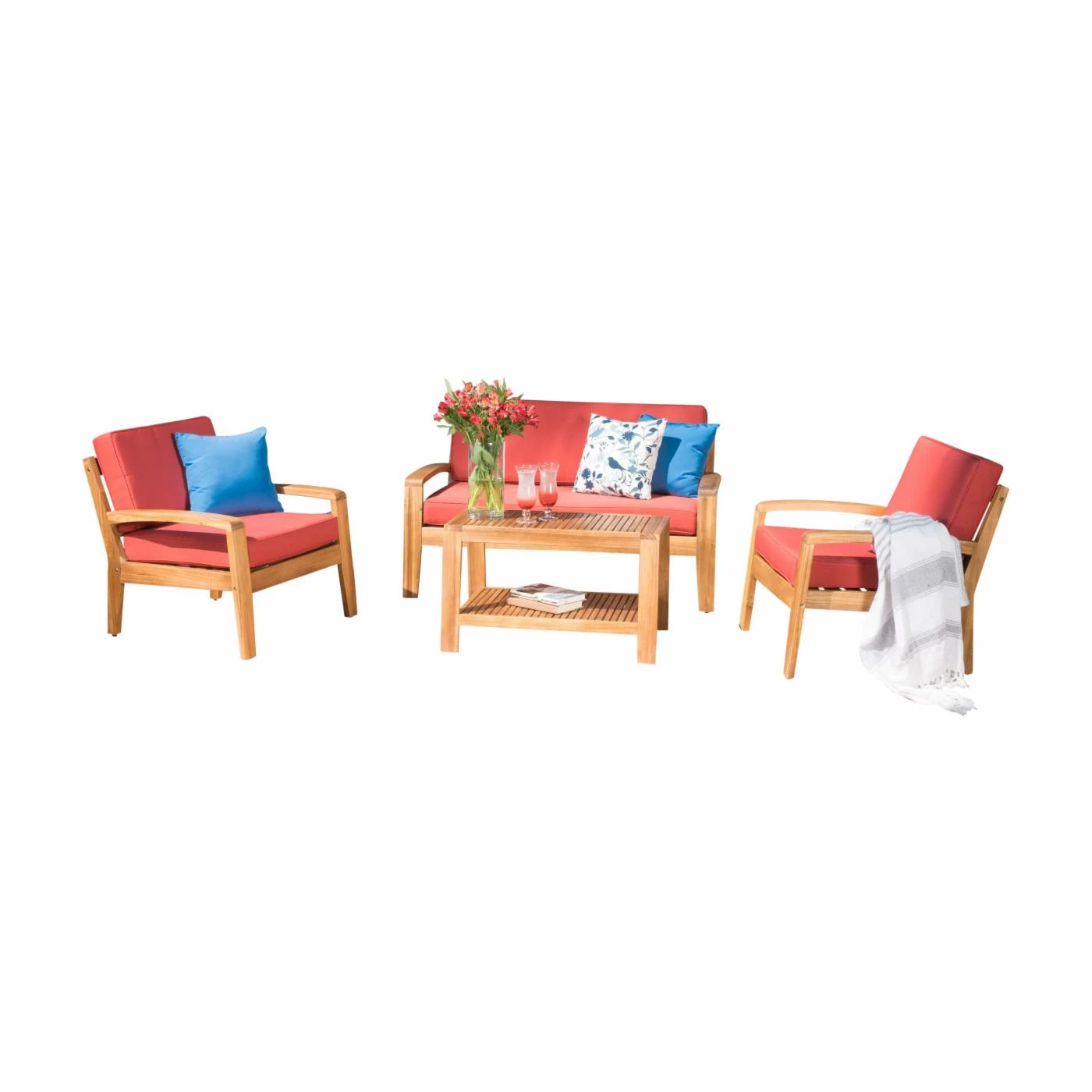 We just can’t imagine a time when the Grenada Wooden 4 Piece Patio Conversation Set might not be a welcome sight as you walk through your back door. This set gives you deep, indulgent seating in a loveseat and two chairs, all made from thick timbers of acacia hardwood. A matching coffee table ties the set together while giving you the practical space you need for relaxing or entertaining. The acacia hardwood is finished in a warm shade of teak that brings out the grain and color of the wood. Extra-thick cushions of dense foam add comfort to the seating pieces. Please choose from available color options.