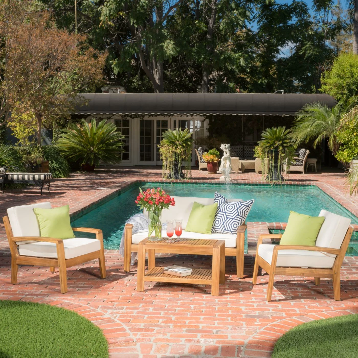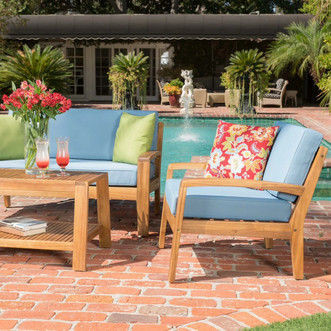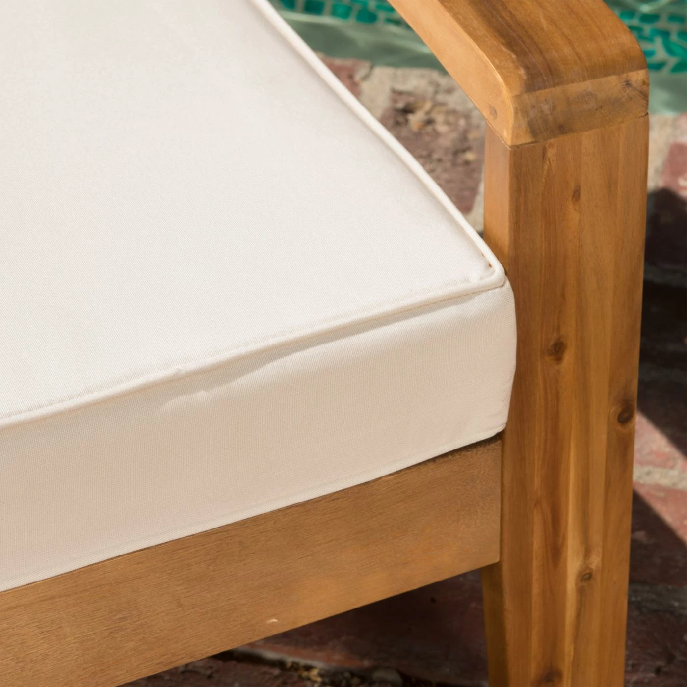 We just can’t imagine a time when the Grenada Wooden 4 Piece Patio Conversation Set might not be a welcome sight as you walk through your back door. This set gives you deep, indulgent seating in a loveseat and two chairs, all made from thick timbers of acacia hardwood. A matching coffee table ties the set together while giving you the practical space you need for relaxing or entertaining. The acacia hardwood is finished in a warm shade of teak that brings out the grain and color of the wood. Extra-thick cushions of dense foam add comfort to the seating pieces. Please choose from available color options.
