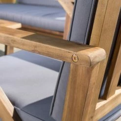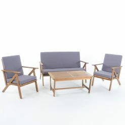 The Panama Acacia Wood 4 Piece Patio Conversation Set is the perfect choice for a space inspired by traditional English gardens or by the rooftop lounges southern California. This set gives you two chairs and a loveseat, each appointed with thick cushions of dense foam. A matching coffee table ties the set together while it provides a practical surface for relaxing or entertaining. Acacia hardwood is used for each piece, and the teak finish adds a warm tone that brings out the color of the material. The water-resistant cushion covers come in a simple shade of gray that’s easy to match to your own outdoor linens and accessories.