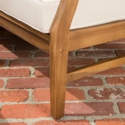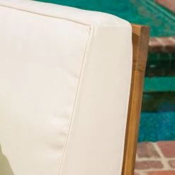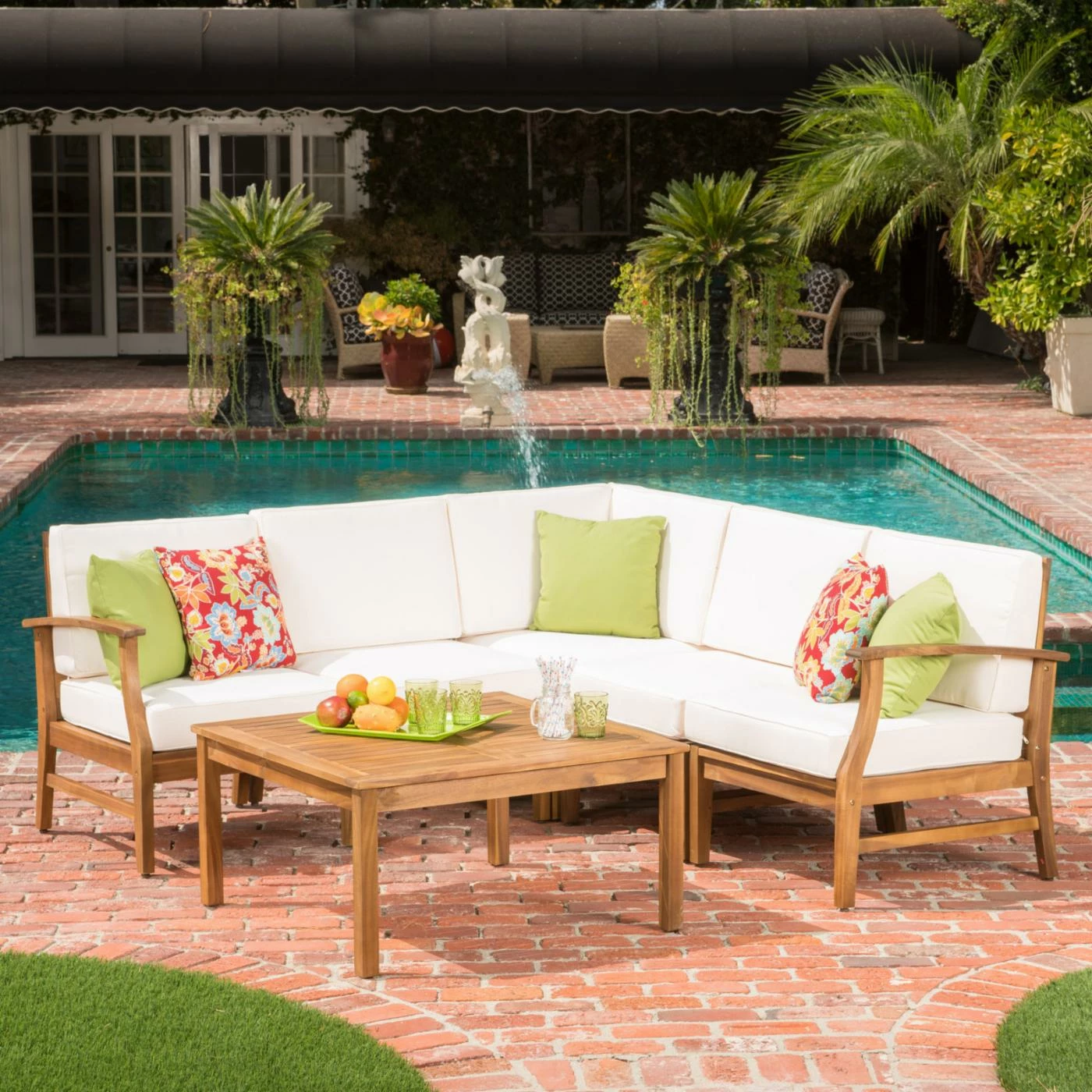 You need this Pearlman 6 Piece Patio Chat Set with Water Resistant Cushions for an outdoor living space as stylish as the one indoors. This L-shaped sectional includes quick-dry cushions and offers room to seat five. Also included is a handy coffee table with slatted design so water slides through easily. Pieces are made of acacia wood in a natural finish and topped with cream colored waterproof cushions. This set comes with a cushioned left arm chair, cushioned right arm chair, two cushioned armless chairs, a corner chair, and a coffee table.
