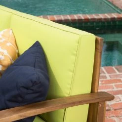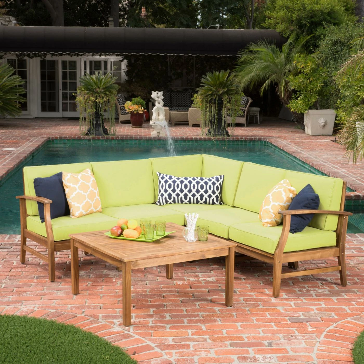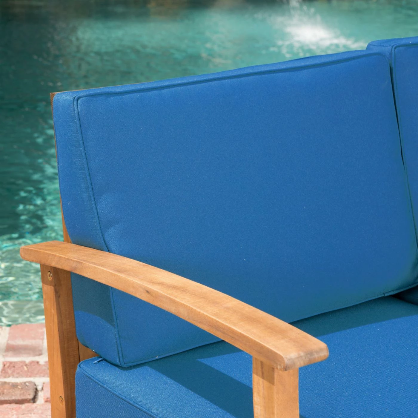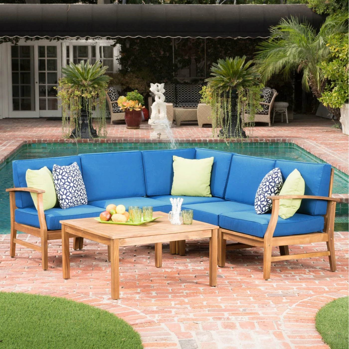The Perla Wooden 6 Piece Patio Sectional Sofa Set is an absolute classic, outfitted with cushy comfort and guaranteed to host you and yours for seasons to come. Included are six pieces – five sectional seats with and without arms, plus a coffee table – each durably crafted with acacia wood, a material revered for outdoor use thanks to its natural water-resistance. Push the pieces together to form a streamlined, slightly rustic L-shaped sofa with softly curved arms; nestle the simple square table in front. The setโs teak finish will weather softly underneath the included water-resistant polyester fabric cushions – choose from the available cushion color options. Assembly is required; a 90-day limited manufacturerโs warranty is included.