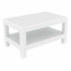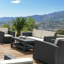 You’ll want to host summer holiday parties and backyard get-togethers every weekend when you have the Compamia Monaco Resin 4 Piece Loveseat Patio Conversation Set with Cushion. Perfect for any outdoor space, this set features a two-person loveseat, two comfortable club chairs, and a coordinating coffee table that brings the contemporary-style furnishings together. Wickerlook resin forms each frame in one unwoven piece that won’t unravel, with no metal that could rust or moving parts that could malfunction. Complementing faux wicker in a selection of finishes are white acrylic cushions for plush seating with the promise of durability.