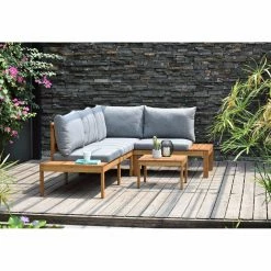 Bring elegant style to your outdoor living space with the Amazonia Sicilia 3 Piece Deep Seat Eucalyptus Wood Conversation Set. This set includes a corner sofa, regular sofa, and coffee table. Each piece is constructed of sustainably sourced eucalyptus wood in a natural teak finish. Soft, quick drying cushions are upholstered in gray polyester, giving the set a modern, neutral look.